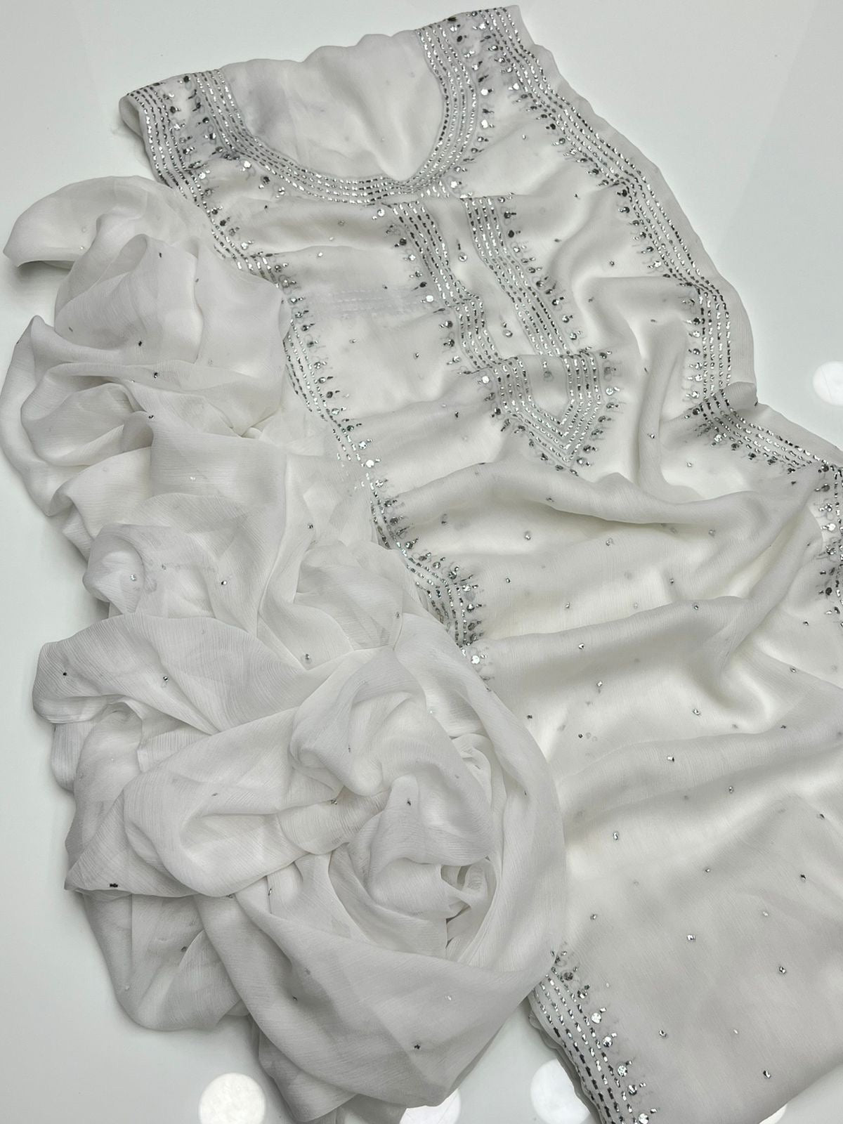Handmade Mukesh Work On Soft Krinkle Chiffon Kurta Style Shirt With Chatta Work Dupatta 2pc Suit👗