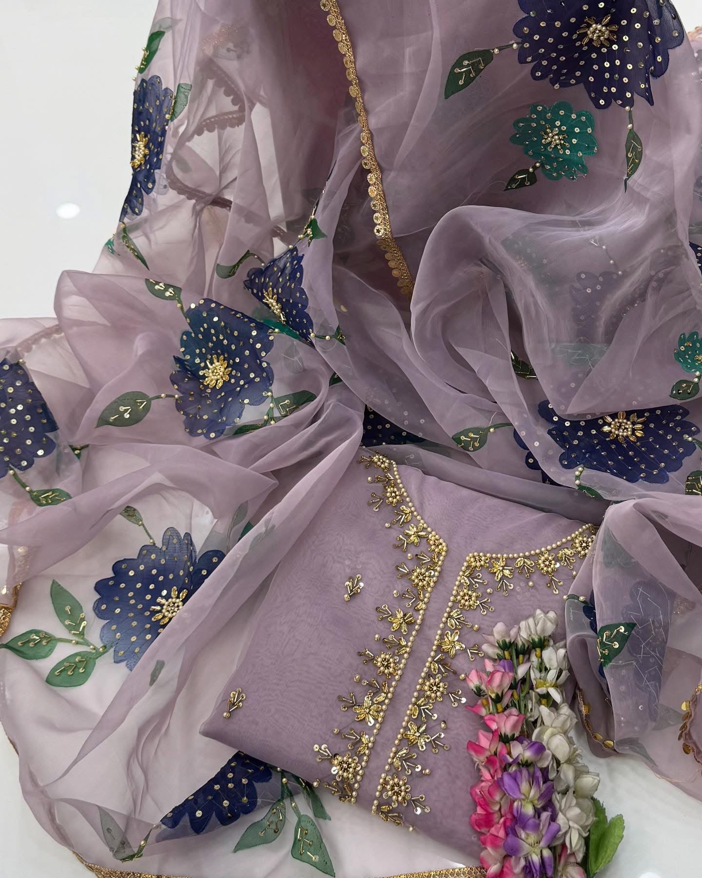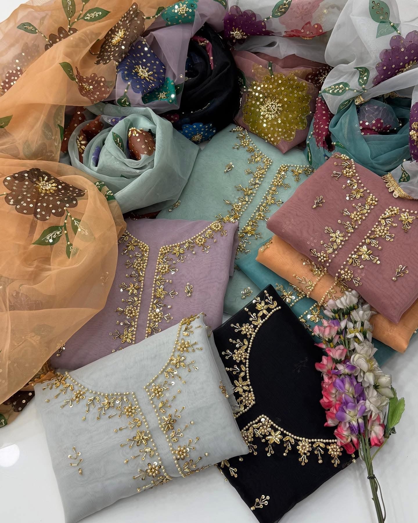 One of the beautiful & Stunning handwork Stones And beads work organza shirt with handwork Zaari Beads work oil paint organza dupata 2 pc dress