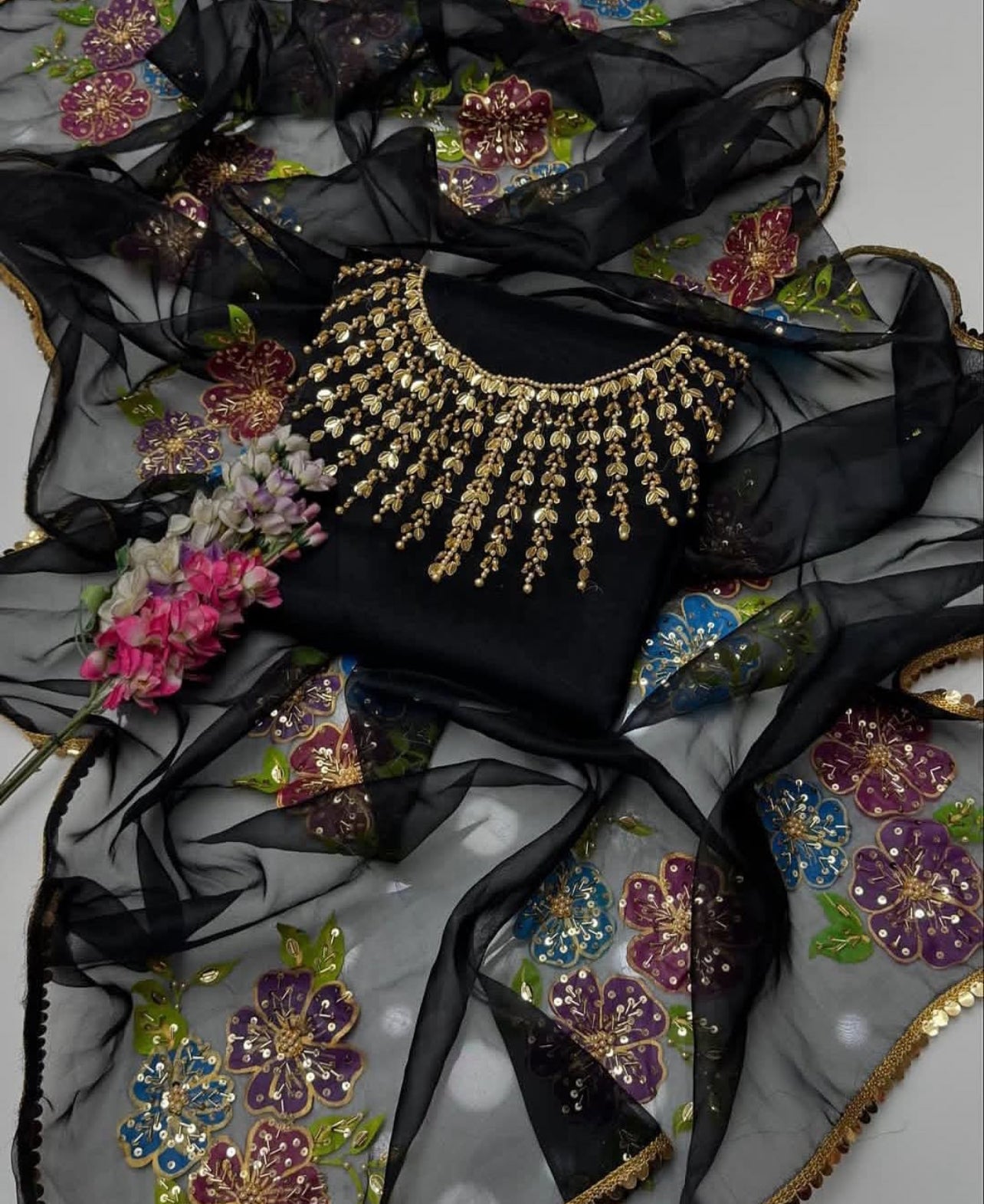 One of the most beautiful and stunning handmade stones and beads work on organza shirt with hand work zaari beads work oil paint organza dupatta