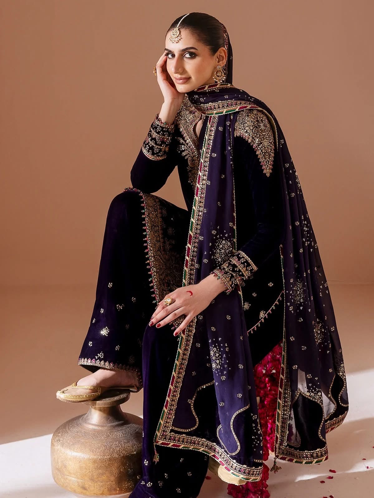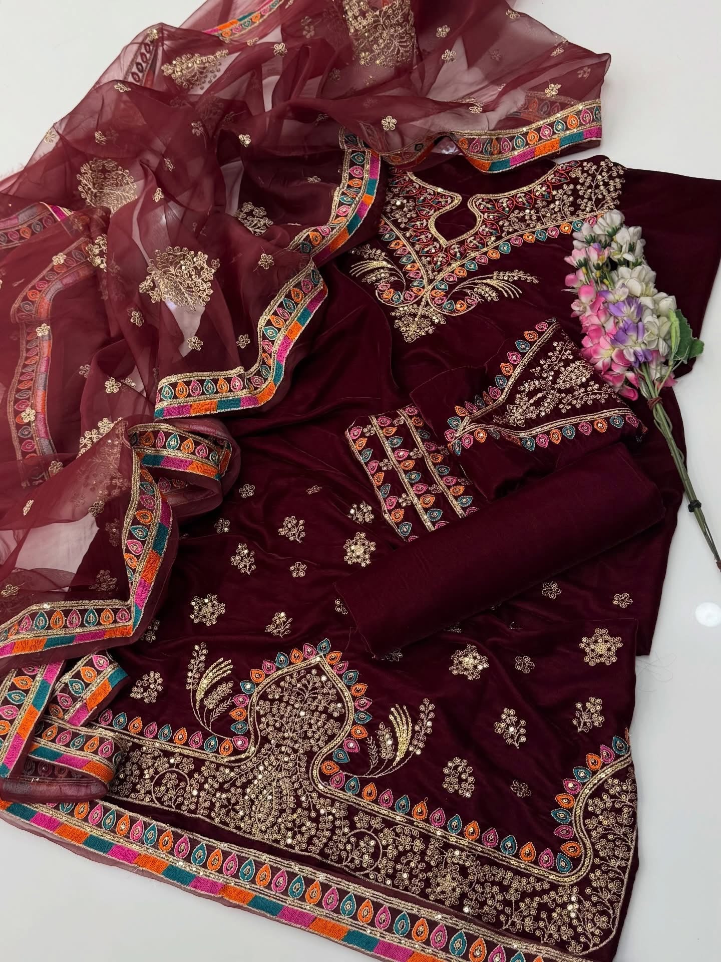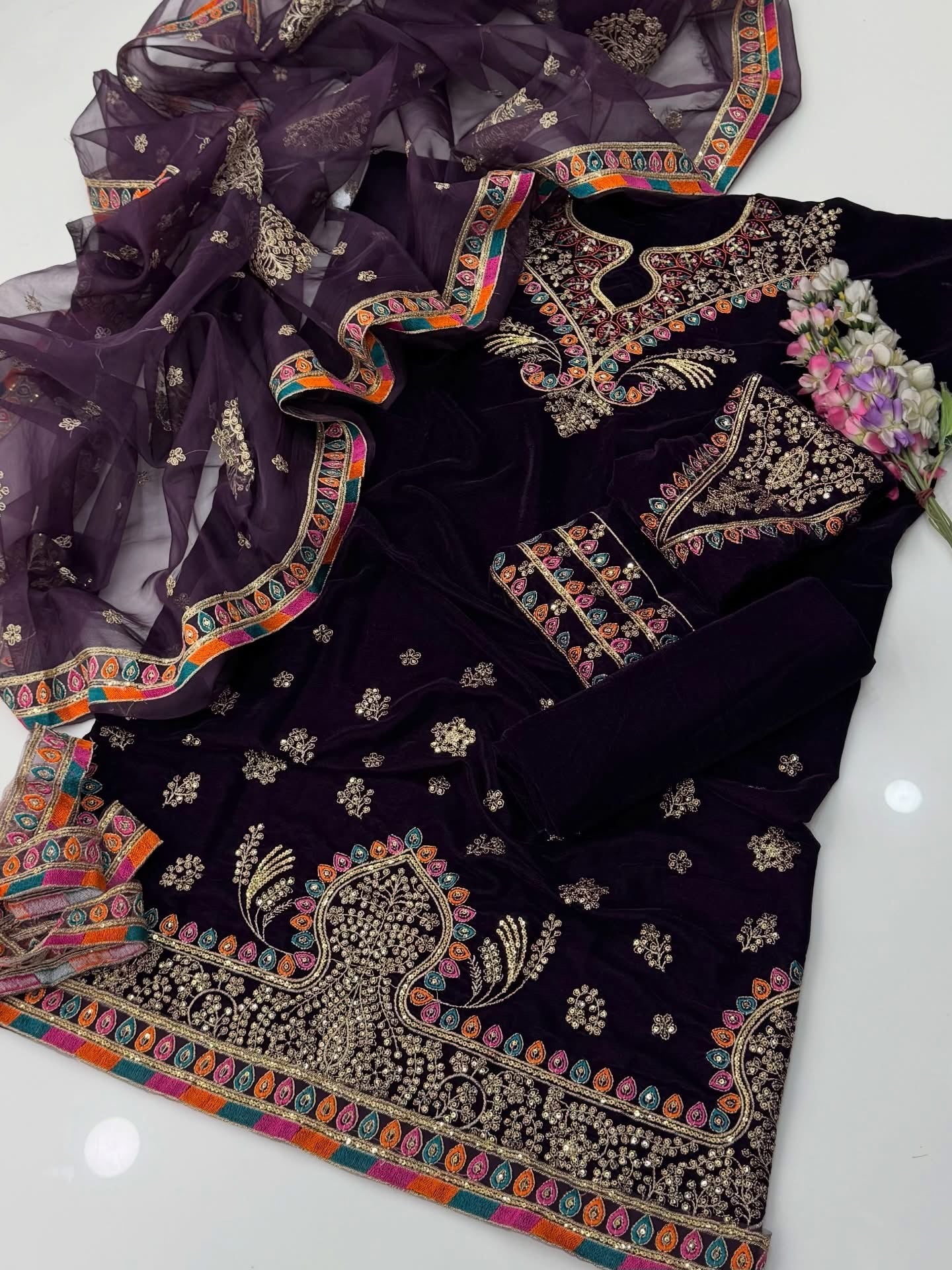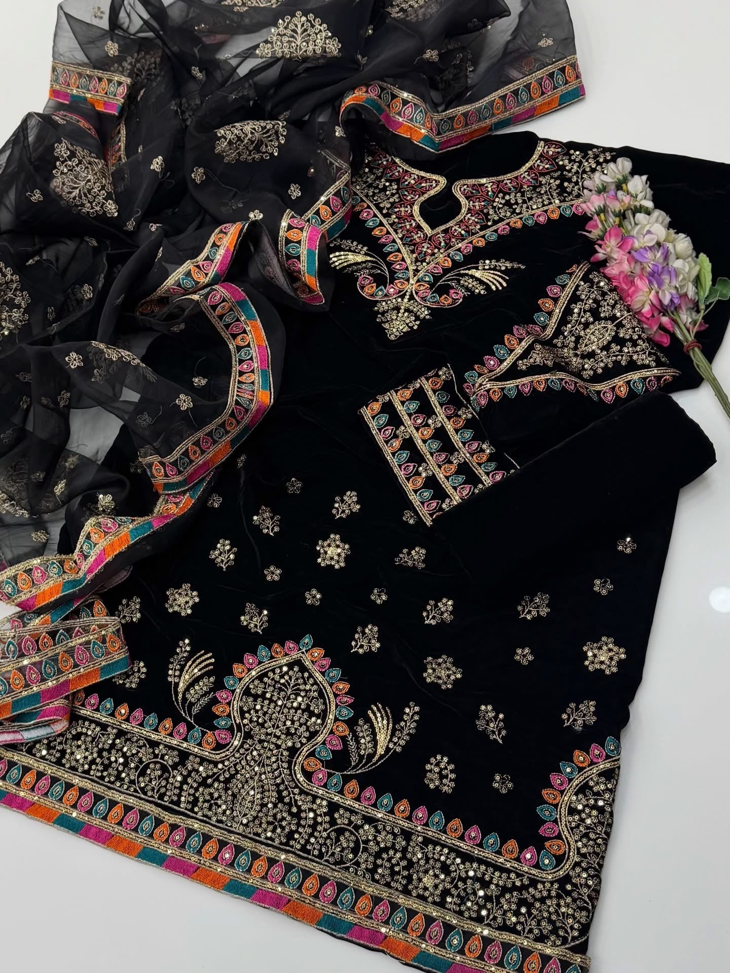 Beautiful Jazmin Brand Heavy Fancy Embroidered Micro 9000 Pound Velvet Shirt & Trouser, Heavy Embroidered Sleeves With Pure Organza Embroidered Duppata 3 PC Dress 👗