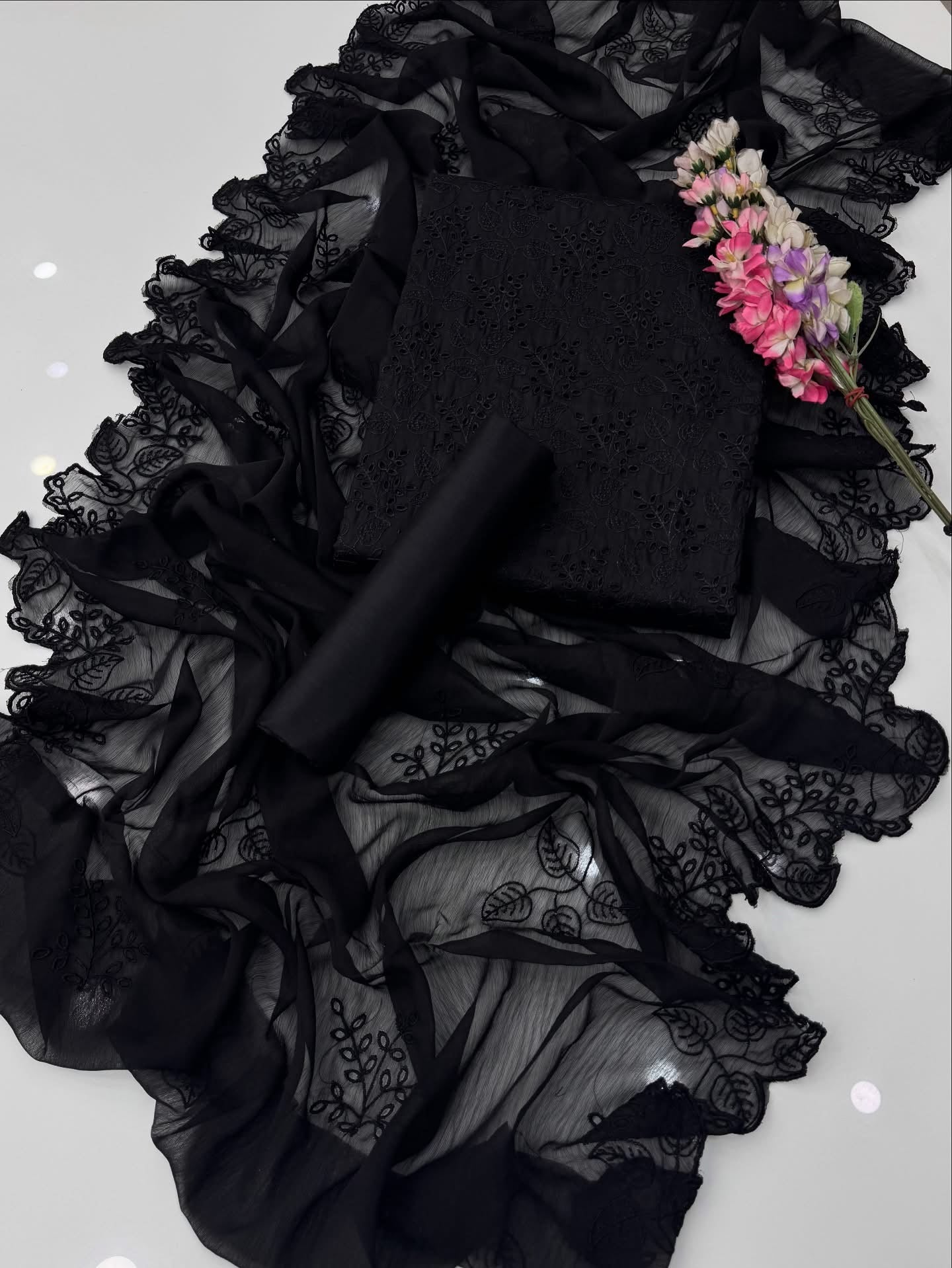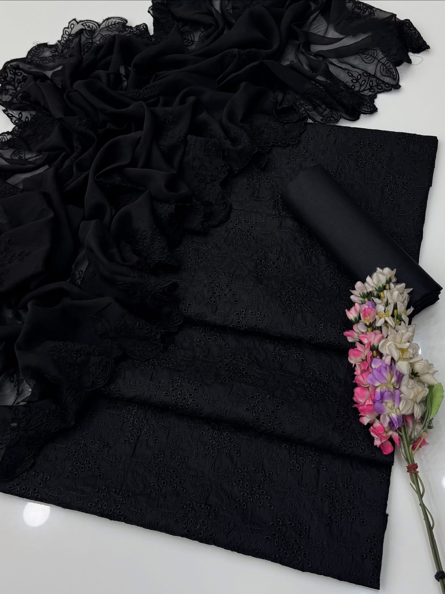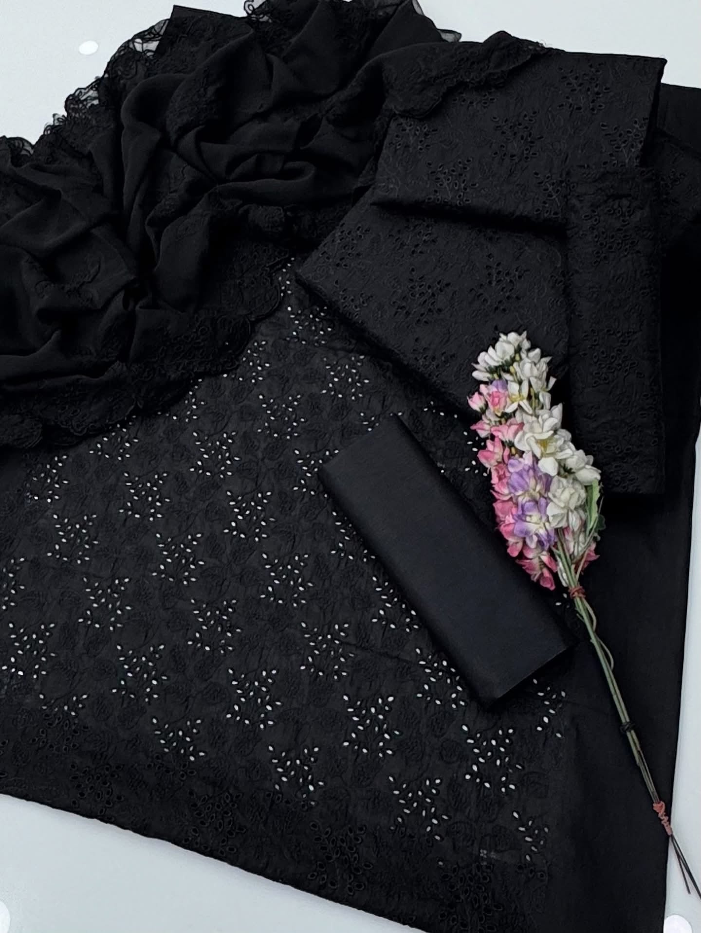 Shiffile Chikankari Boring Embroidery 🧵 Lawn Shirt , Plain Lawn Trouser Along With Cut Work Embroidered Chiffion Duppata 3 Pc