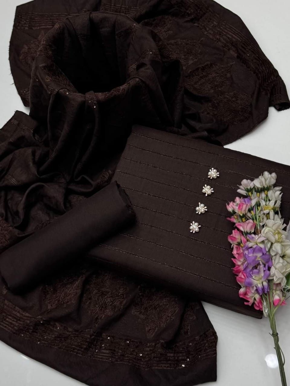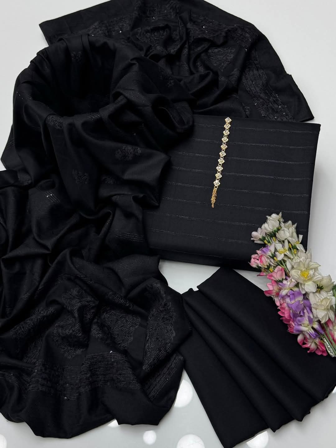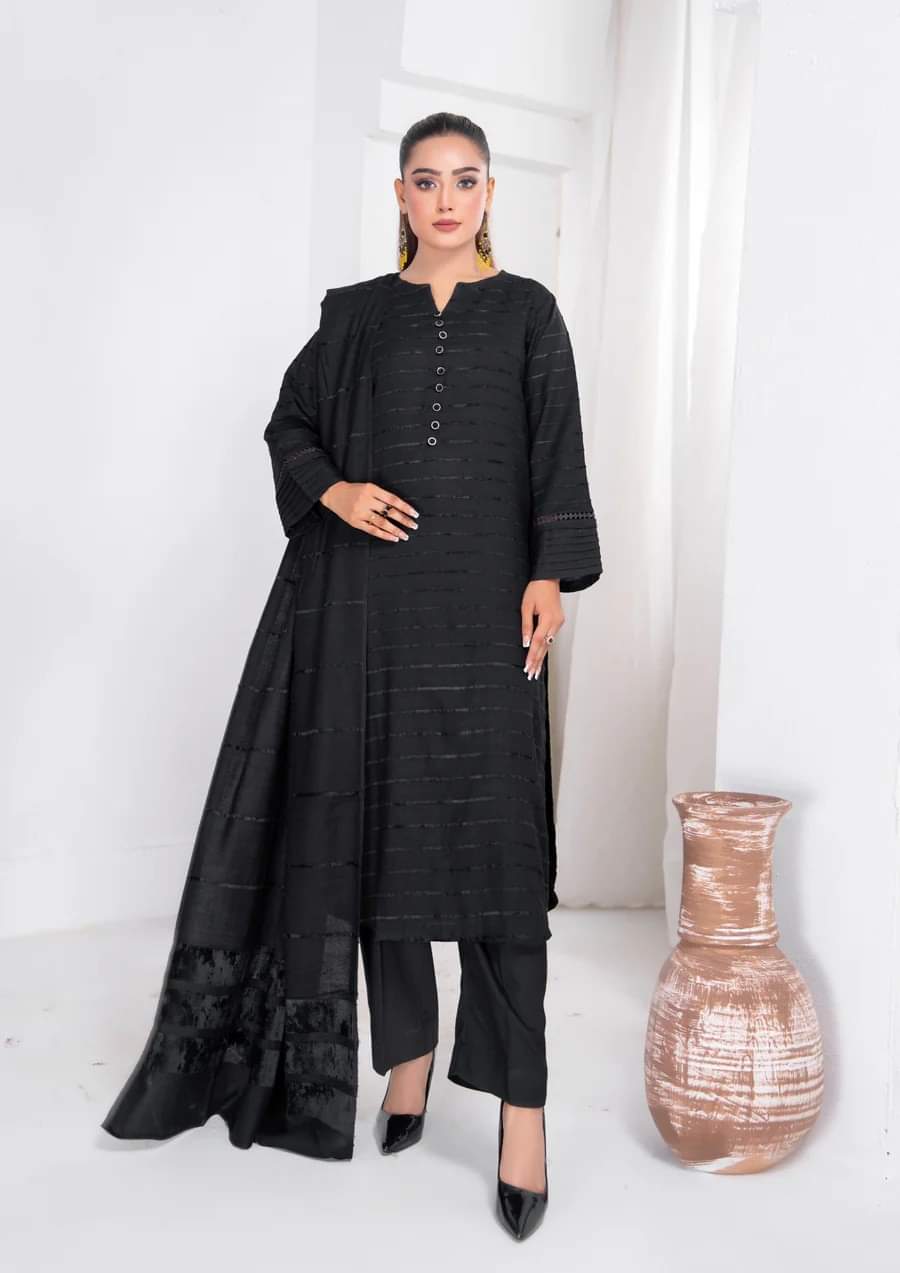 💕 Embrace the elegance of velvet this fall/winter with our 3Pc Dhanak Velvet Border Shirt, Plain Dhanak Trouser & Paired with a luxurious Jacquard Velvet Border Shawl 3 Pc Dress 👗