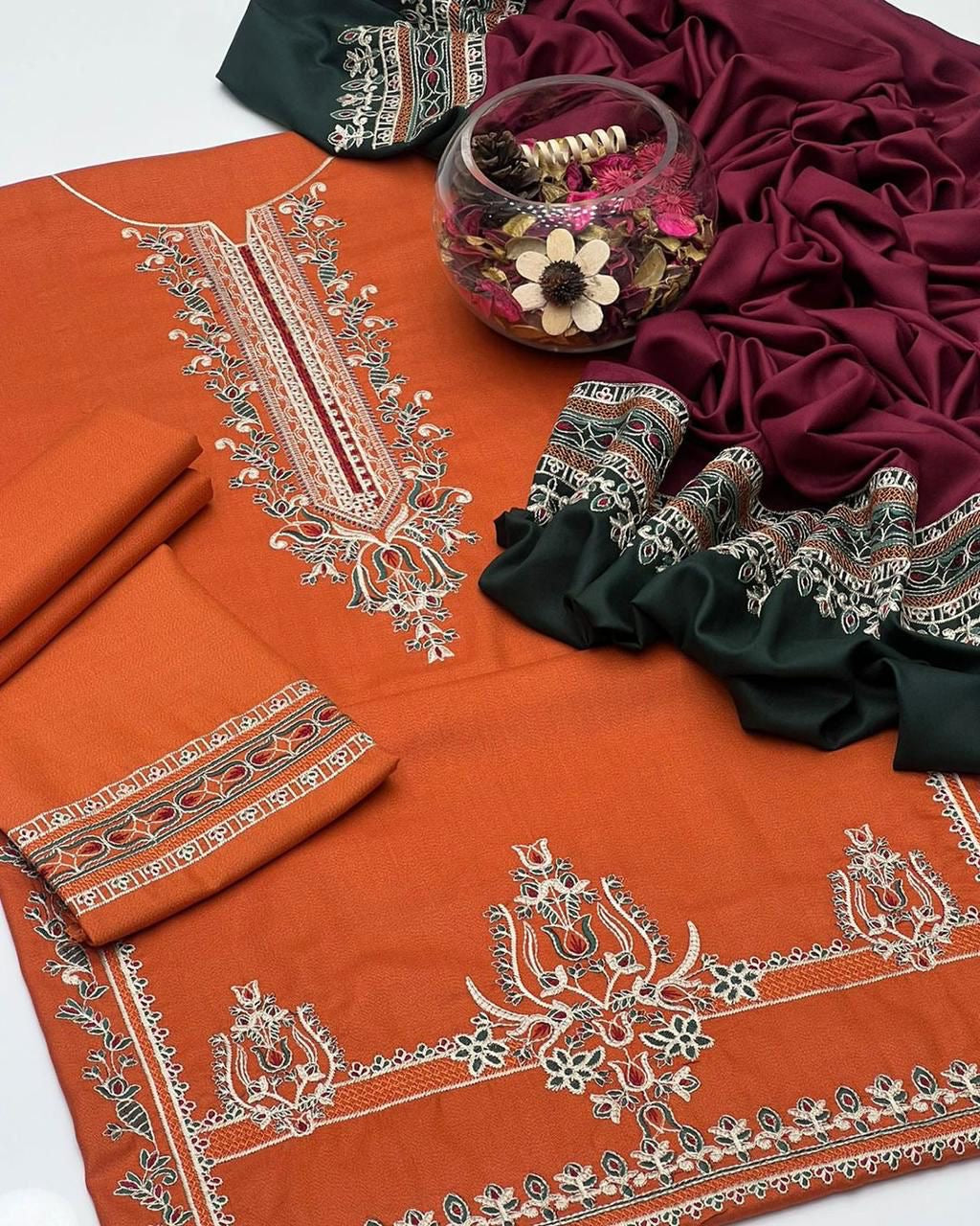 Dhanak Embroided Shirt With Embroided Sleeves With Dhanak Simple Trouser Along With Dhank Embroided & Digital Print Shawl 3Pcs Dress 👗