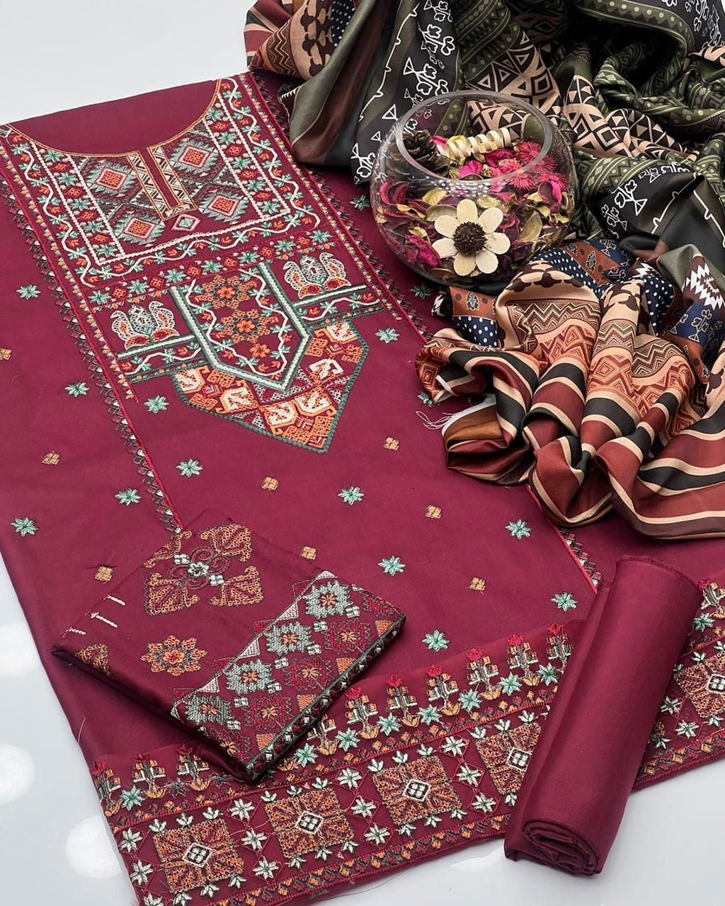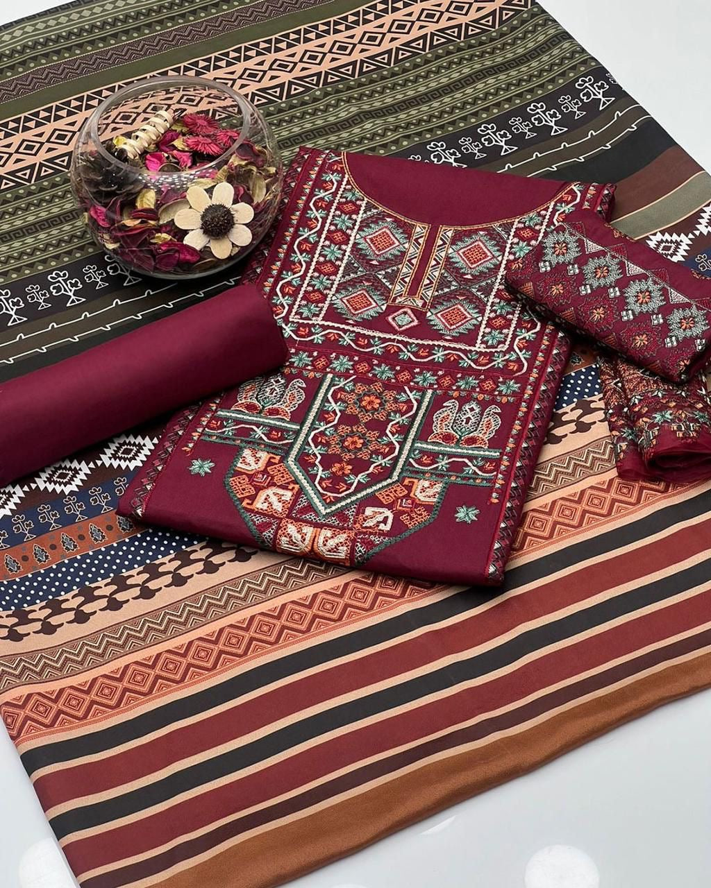 Dhanak Embroided Shirt With Embroided Sleeves With Dhanak Simple Trouser Along With Dhank Embroided & Digital Print Shawl 3Pcs Dress 👗