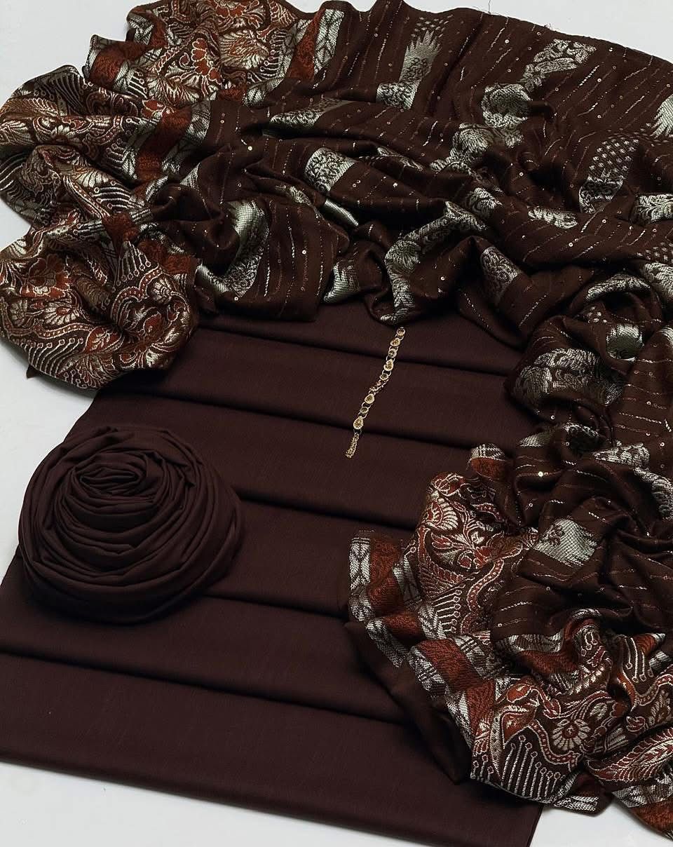 Beautiful & Elegant Style Plain Dhanak Marina Shirt & Trouser With Wool Jacquard Border Sequence Work Shawl 3 PC Dress