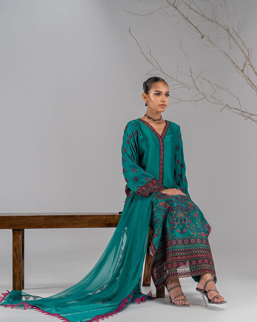 Beautiful digital print on soft shamoze silk for a graceful fall, paired with a simple silk trouser for comfort and elegance. The silk tie & dye dupatta adds a vibrant touch, completing your look effortlessly for casual gatherings or semi-formal occasions.