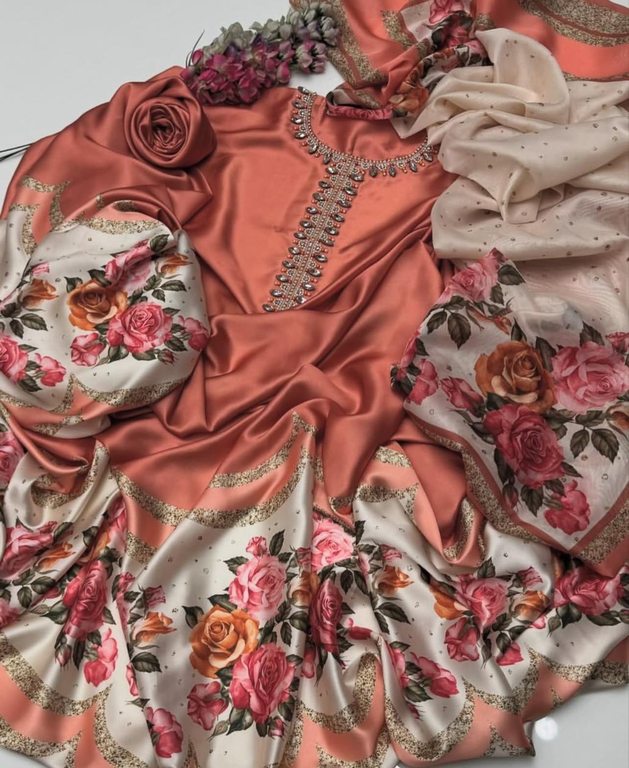 Handwork Embriodred neckline Shamoze Silk Digital Print Shirt, Shamoze Silk Digital Print Trouser Along With Silk Digital Print Dupatta 3 Pcs Dress
