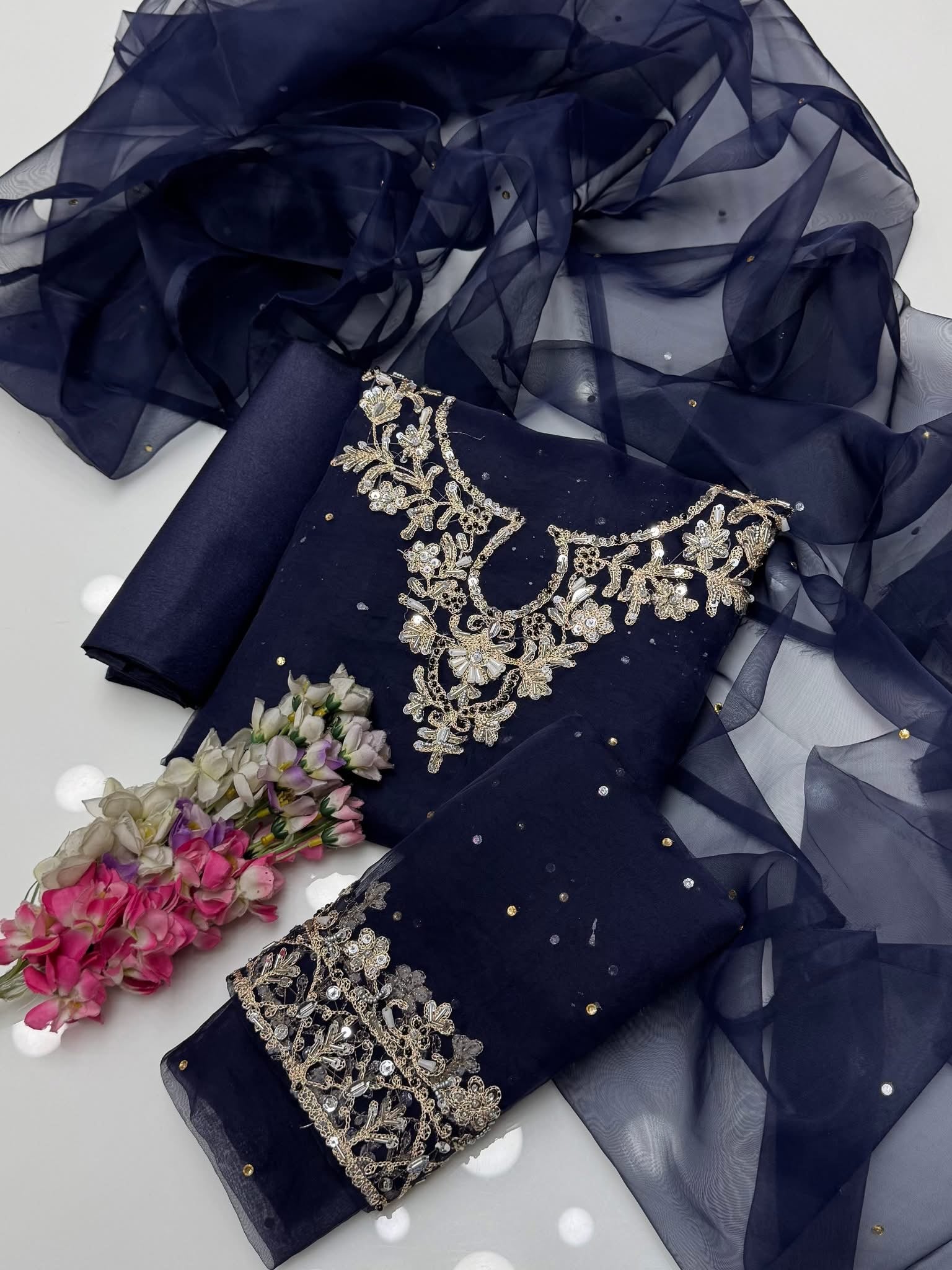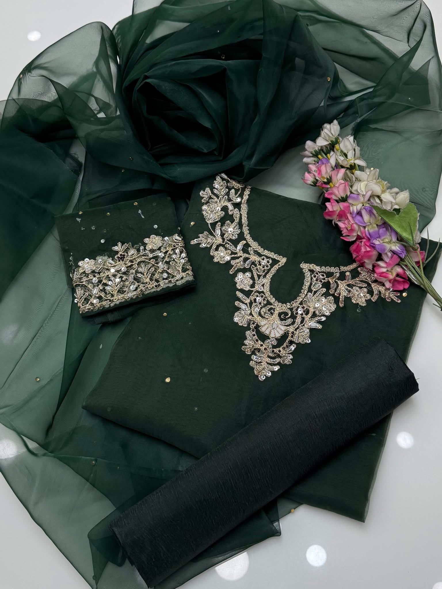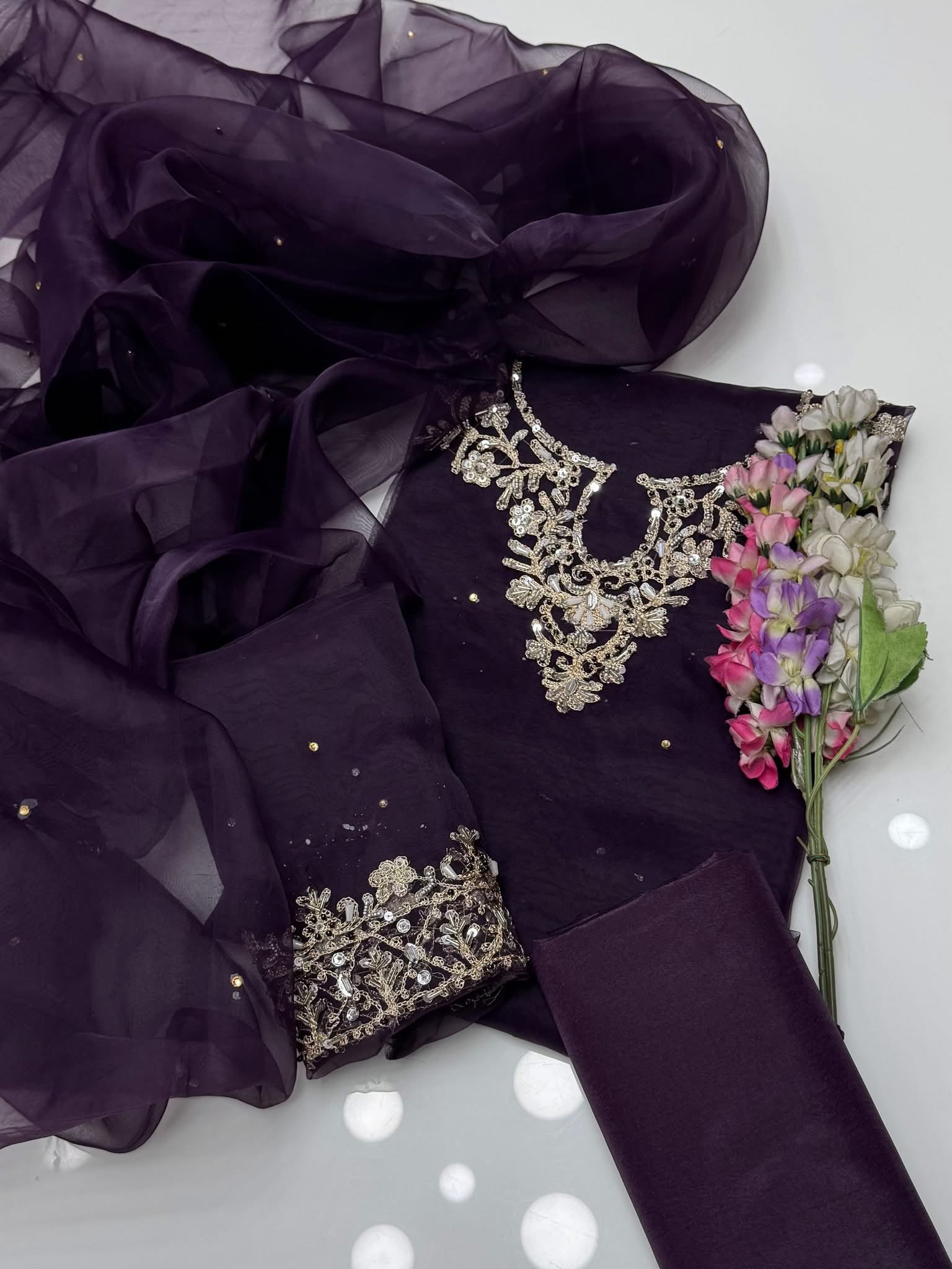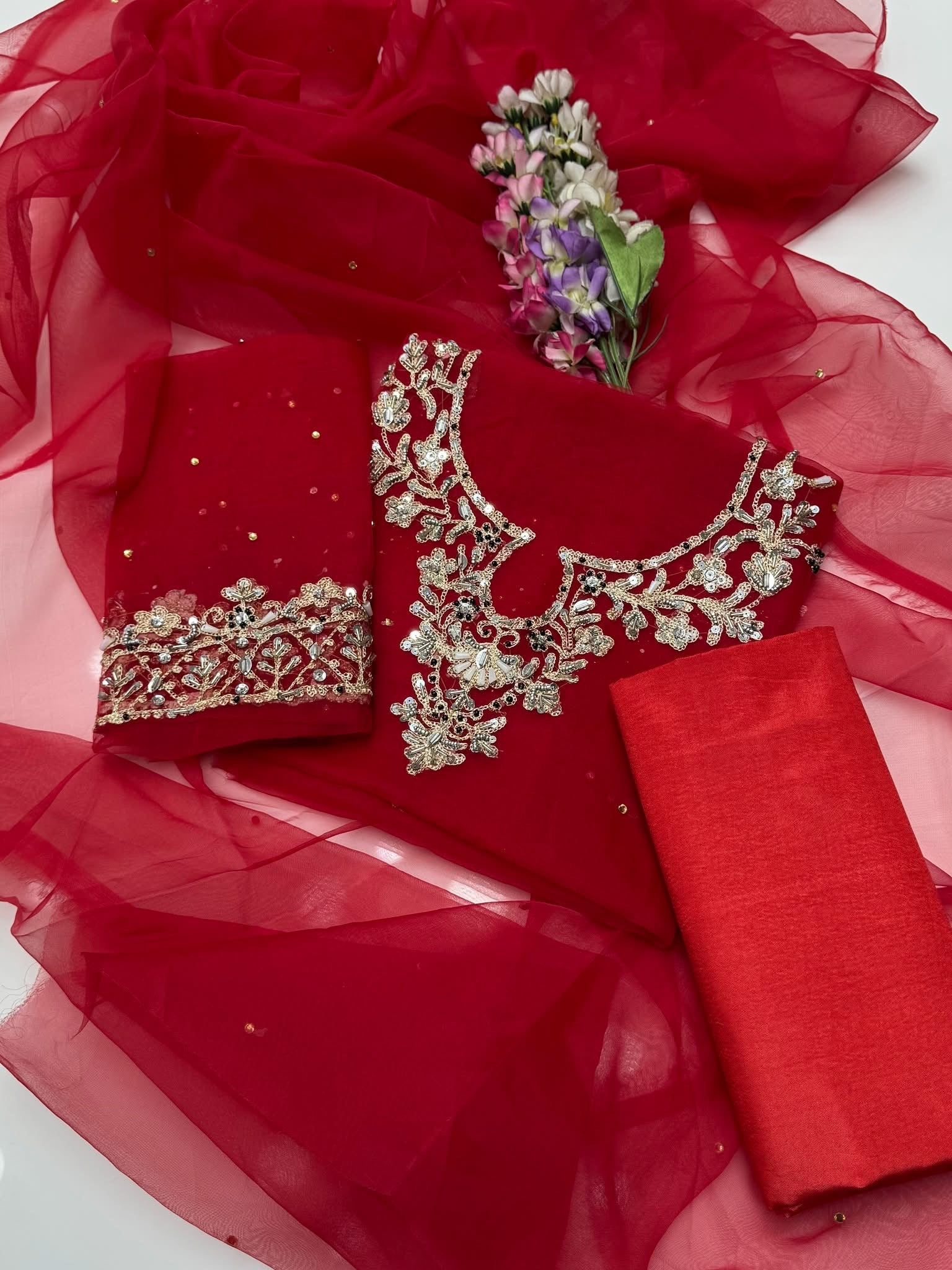 Handmade Beads Kundan Embroidery With Zaari Work Organza Shirt Along With Organza Embroidered Duppata & Plain Trouser 3 Pc Dress 👗Â