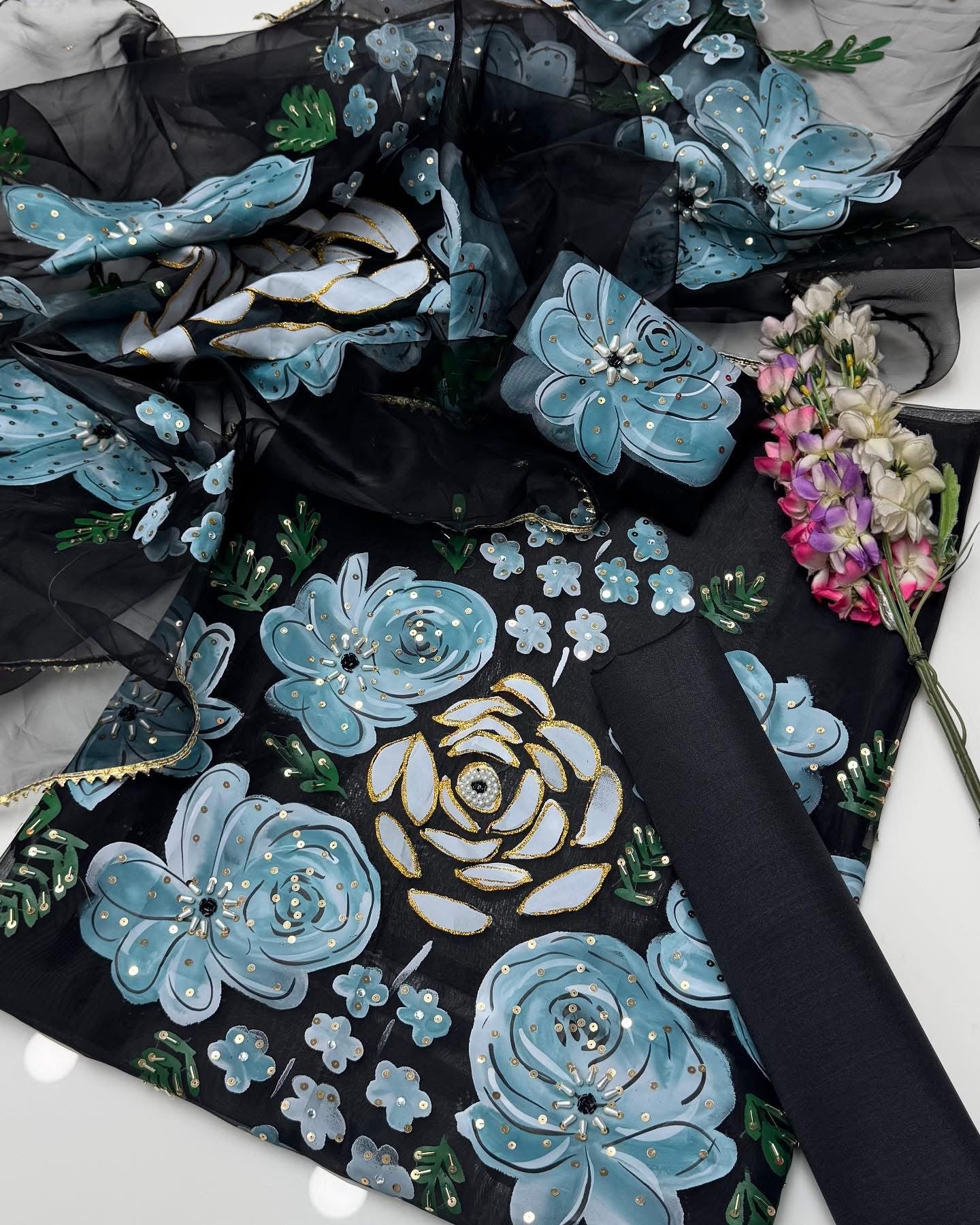 Handmade Oil Painted 🎨  With Handwork Sequence Beads Work Organza Shirt And Duppata With Katan Silk Trouser 3 Pc Dress 👗Â