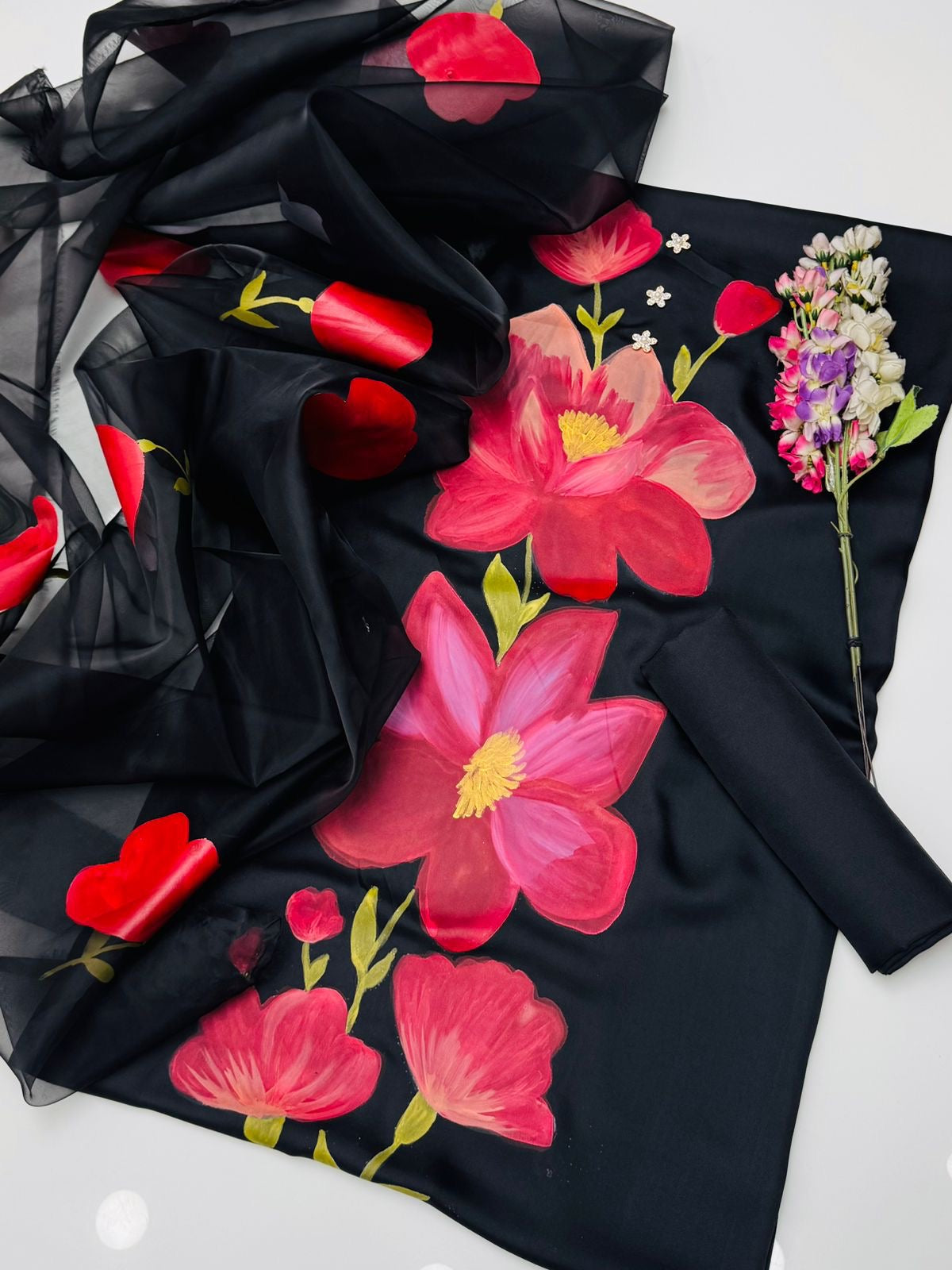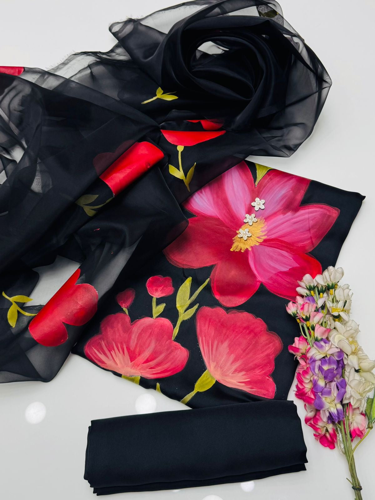 Handmade Oil Gliter Painted 🎨 Shamooz Silk Shirt & Trouser Along With Oil Paint 🎨 Organza Duppata 3 Pc Dress 👗Â