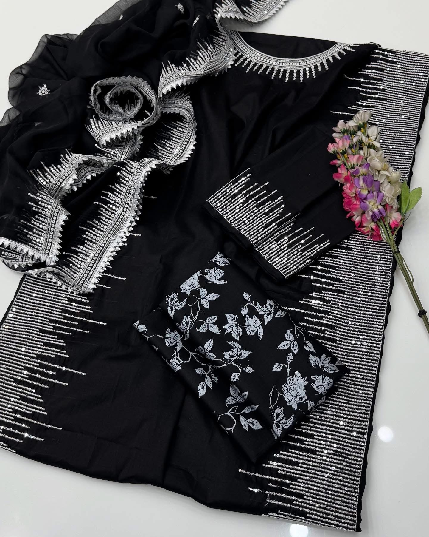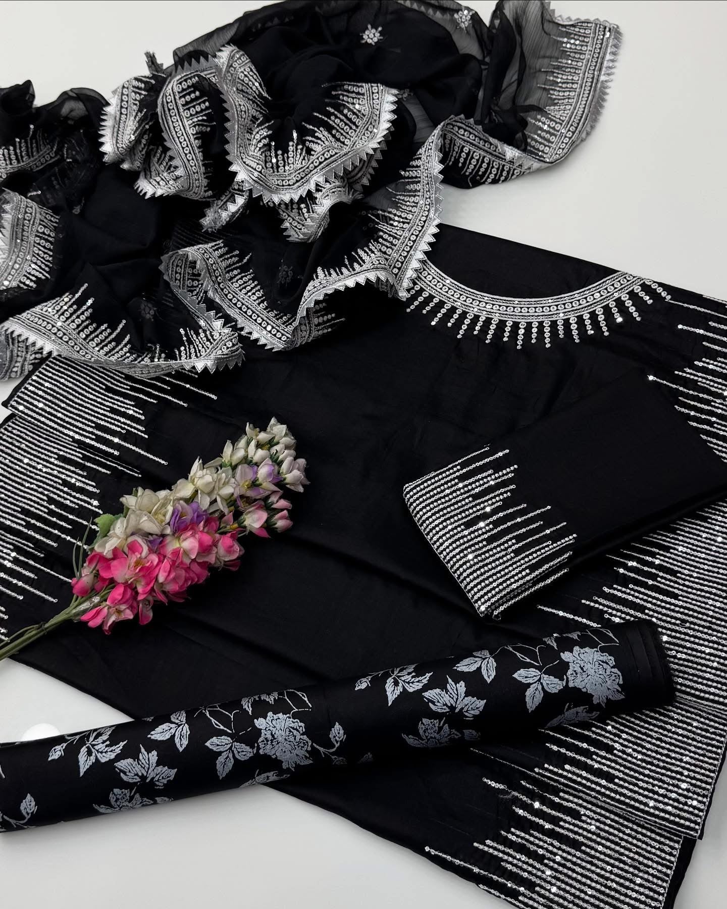 Beautiful And Elegant Fancy Sequence Embroidery 🧵 Lawn Shirt And Printed Trouser Along With Sequence Embroidery Ready Chiffon Duppata 3 PC Dress 👗