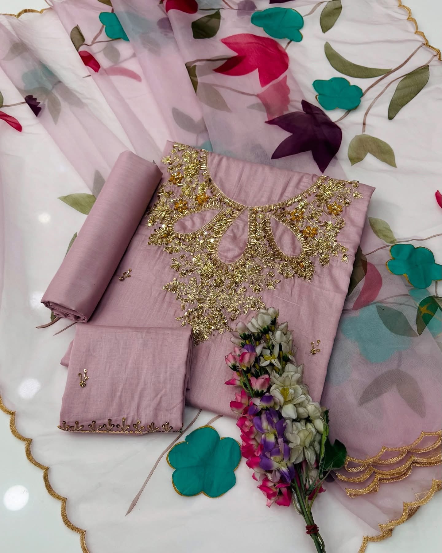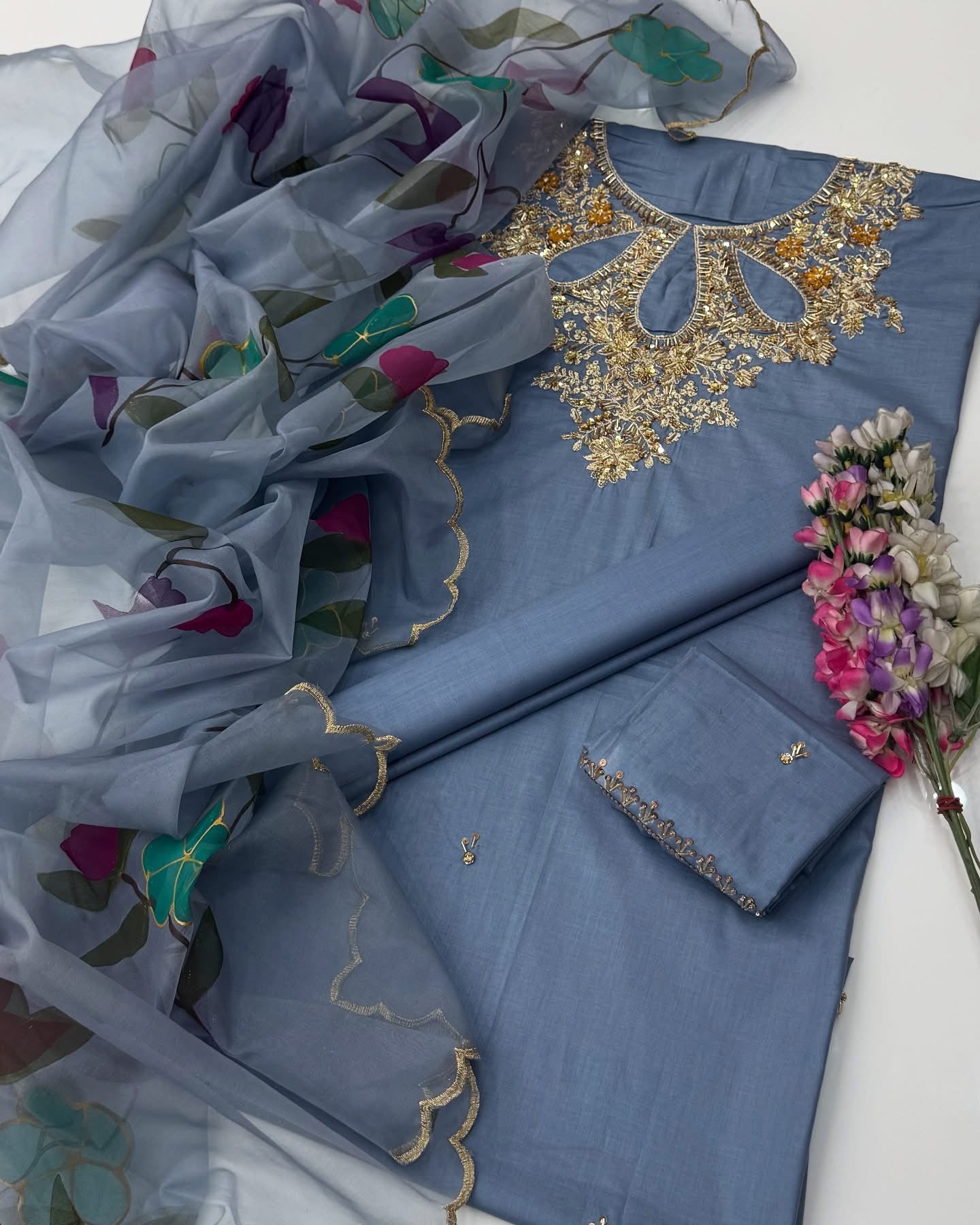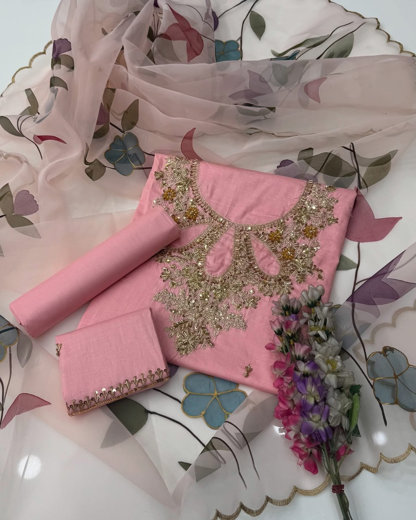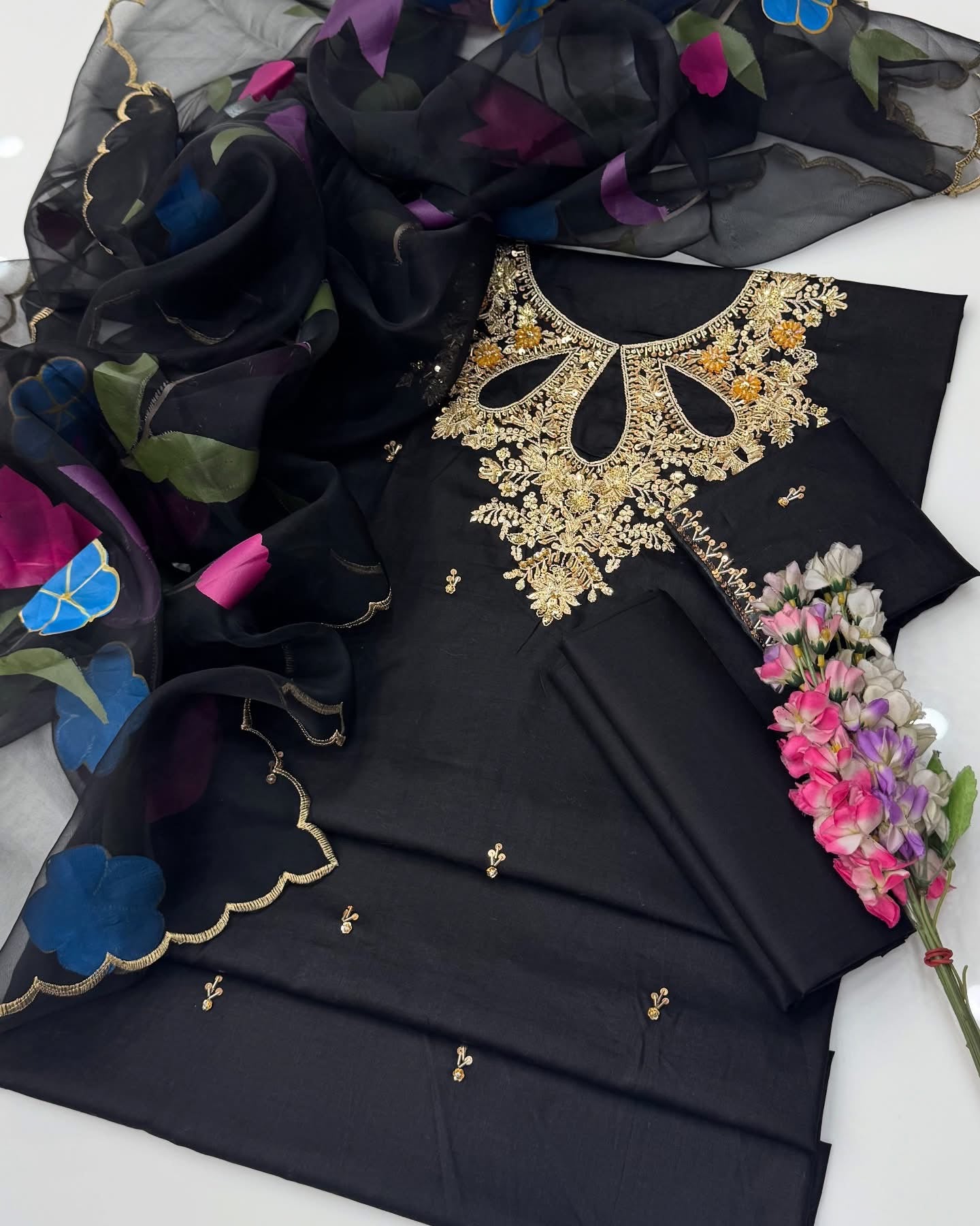 One Of The Beautiful & Stunning Handwork Stones And Beads Work Lawn Shirt & Trouser With Oil Paint 🎨 Organza Duppata 3 Pc Dress