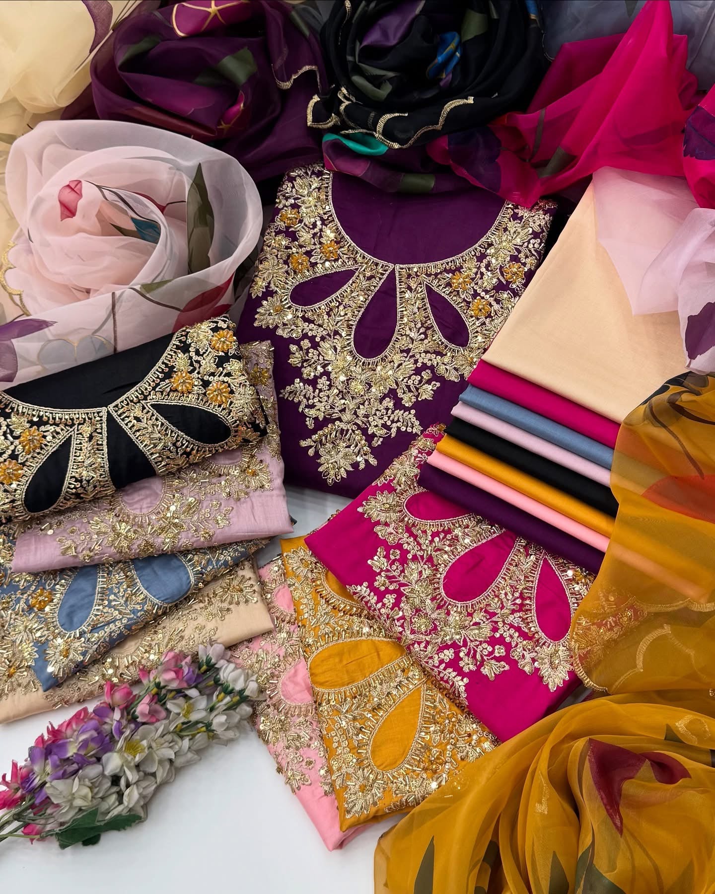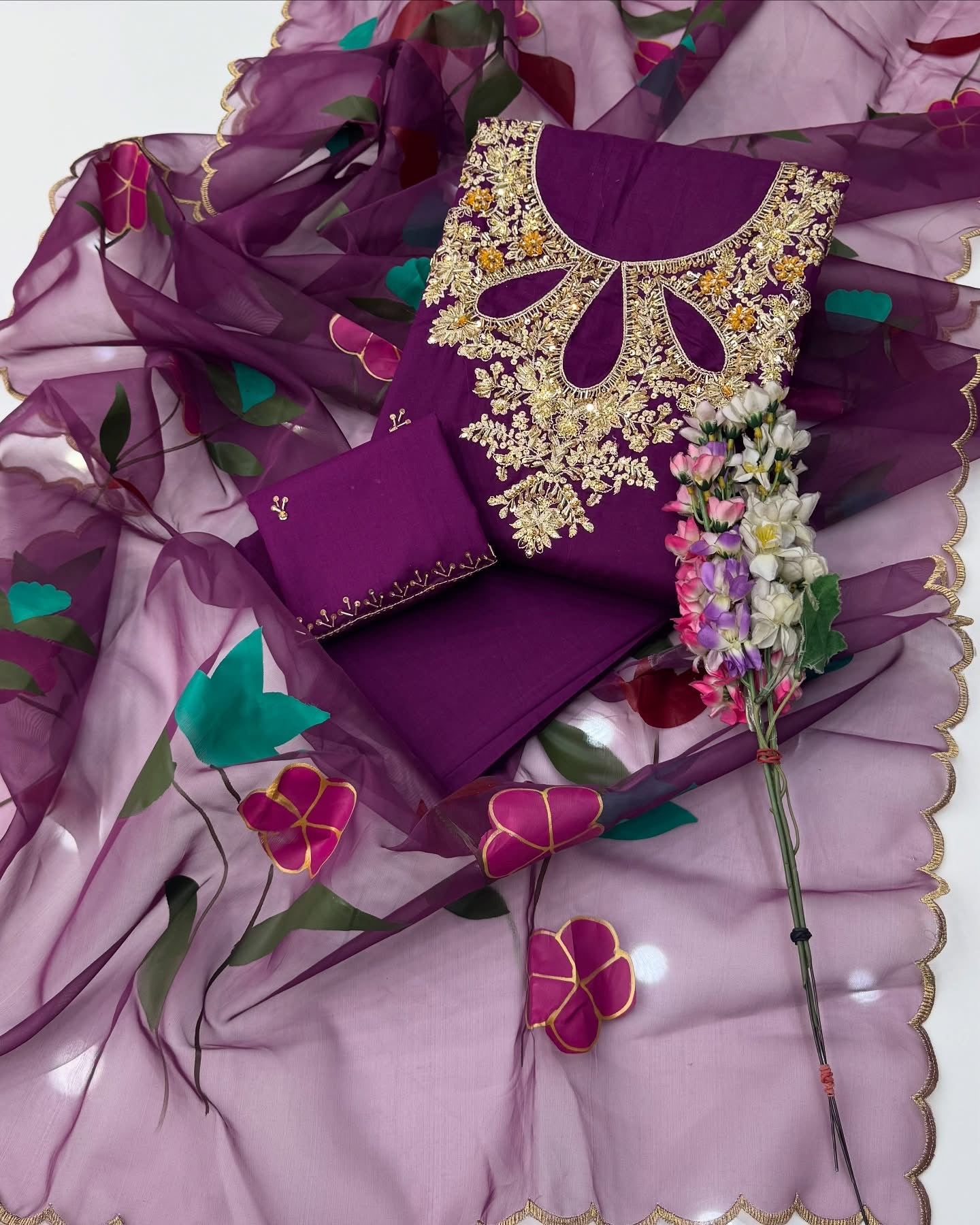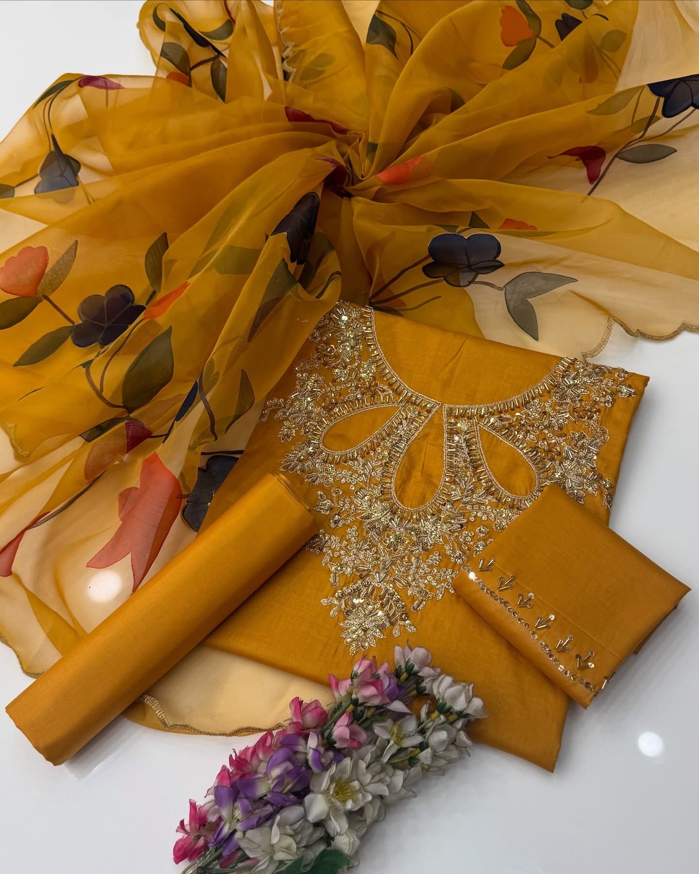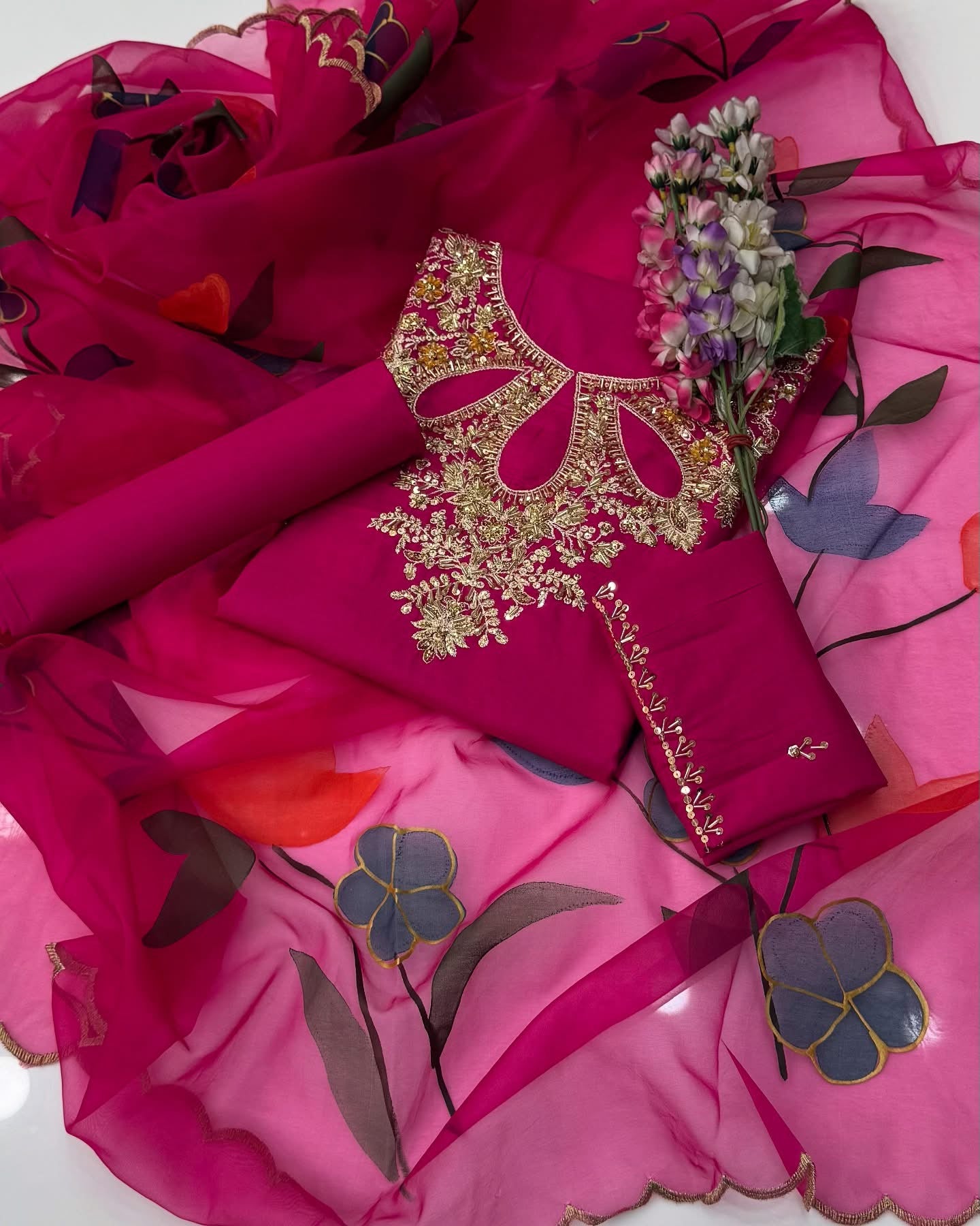 One Of The Beautiful & Stunning Handwork Stones And Beads Work Lawn Shirt & Trouser With Oil Paint 🎨 Organza Duppata 3 Pc Dress