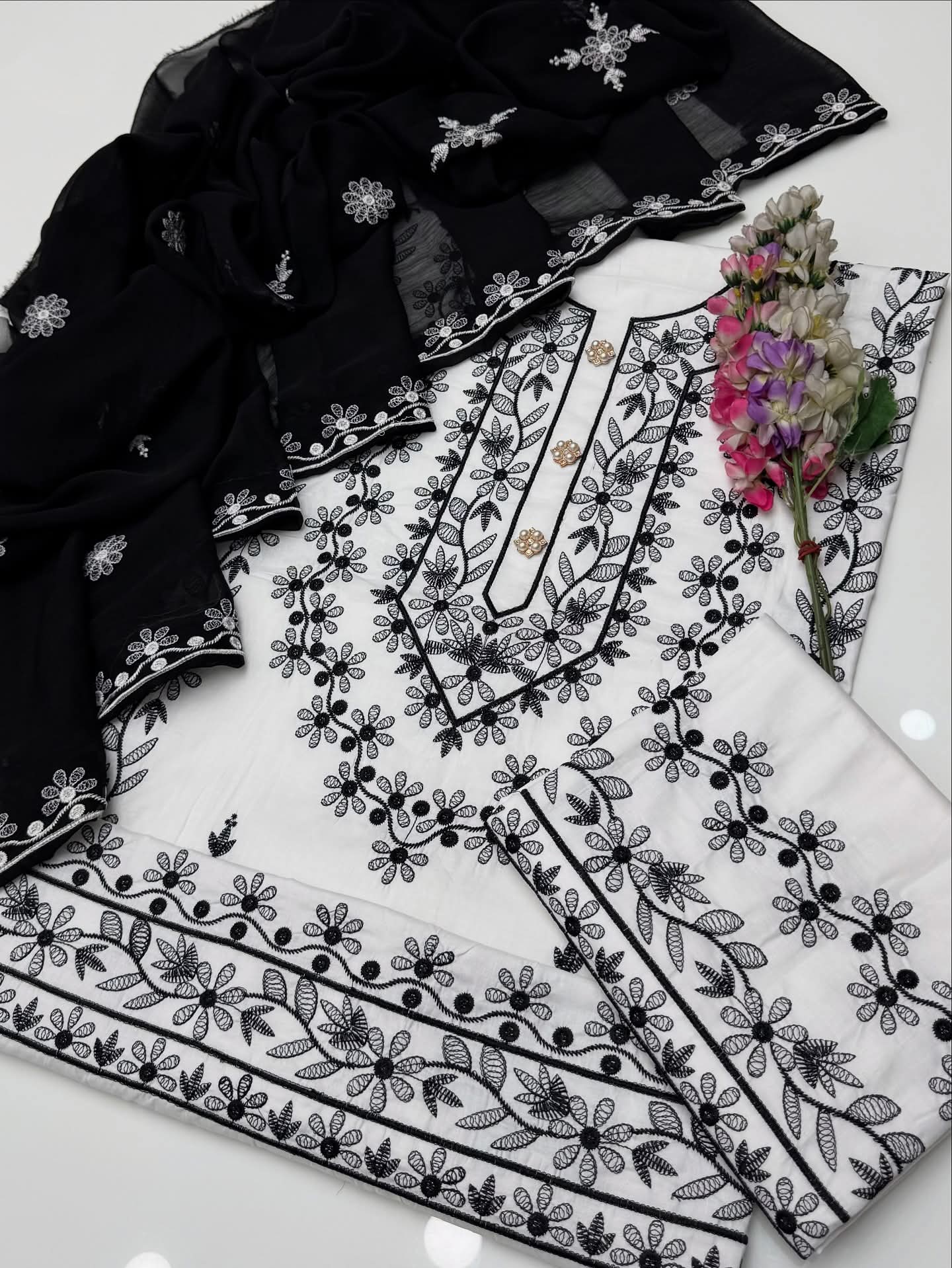 Beautiful Handmade Style Embroidered 🧵Galla Daman Lawn Shirt & Trouser Along With Chiffion Embroidered Duppata 3 Pc Dress 👗Â