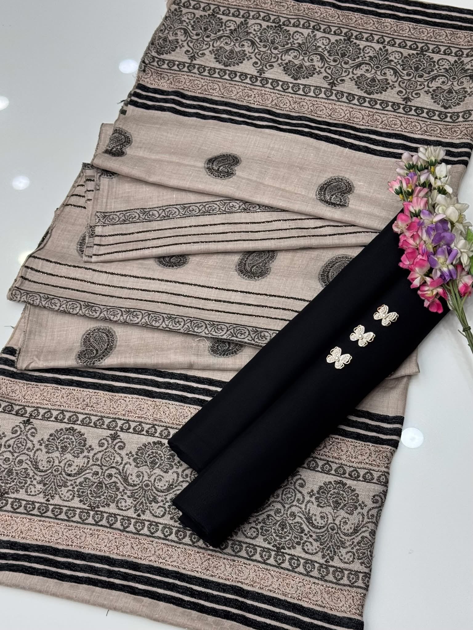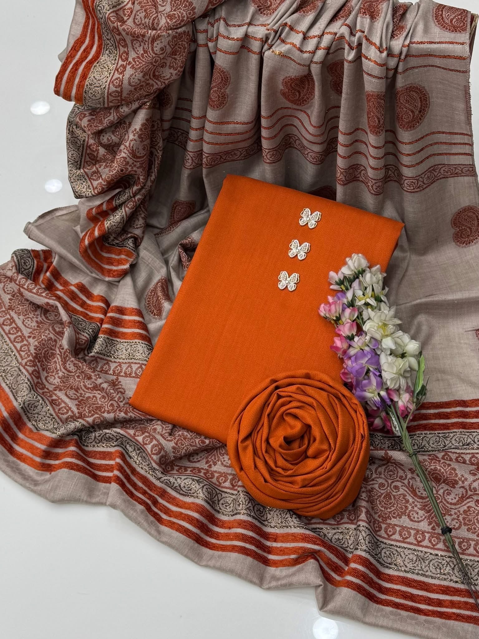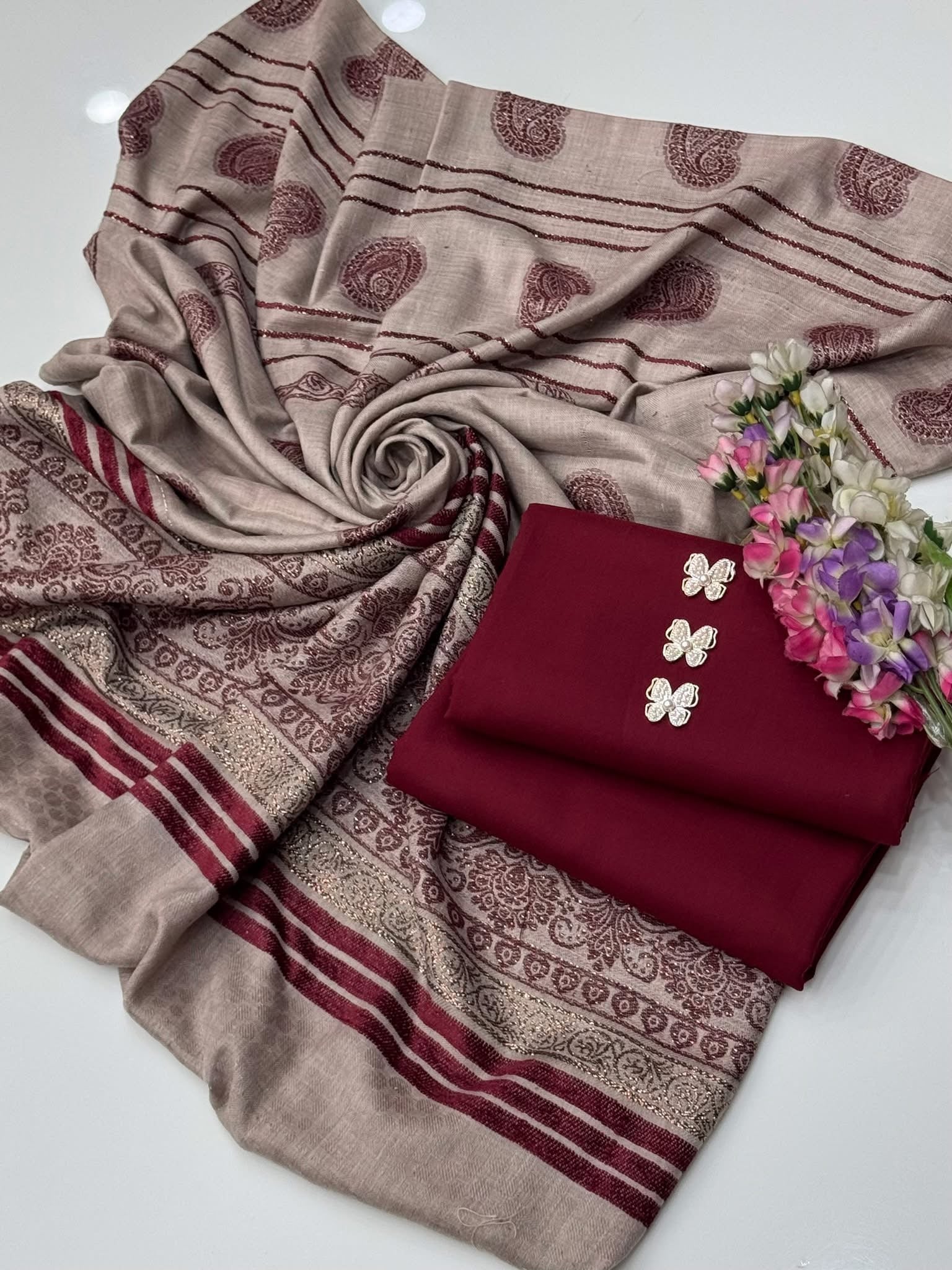 Plain Soft Marina Dhanak Shirt & Trouser Including Neckline Along With Pashmina Wool Valvet & Banarsi Tilla Shawl 3 Pcs Dress