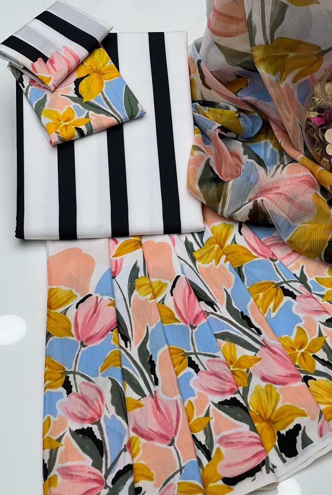 Monar Fabric Digital Lining Print shirt With Lining & Flower Digital Print Sleeves With Monar Digital Print Trouser Along With Chiffon Digital Print Dupatta 3Pcs Dress 👗.