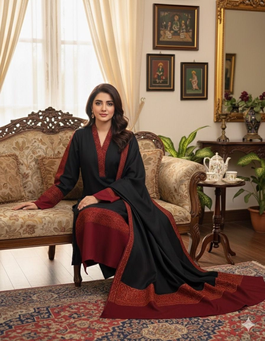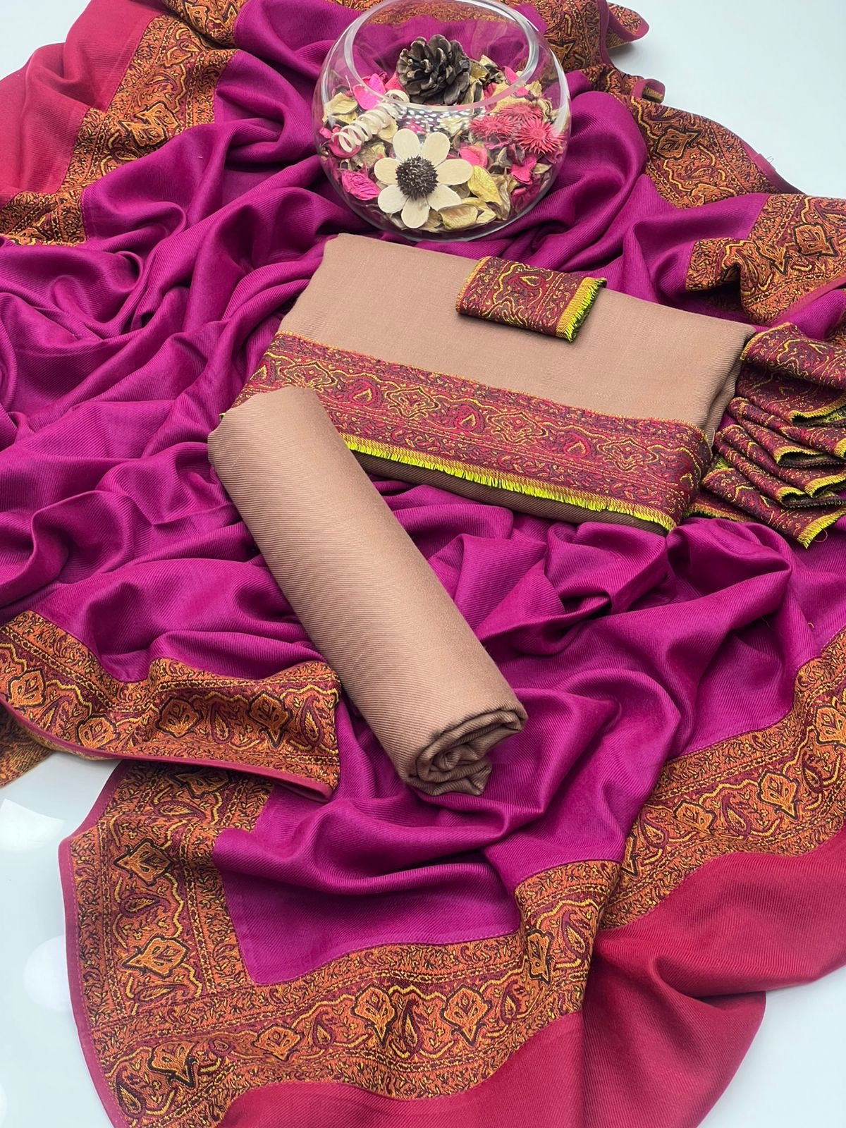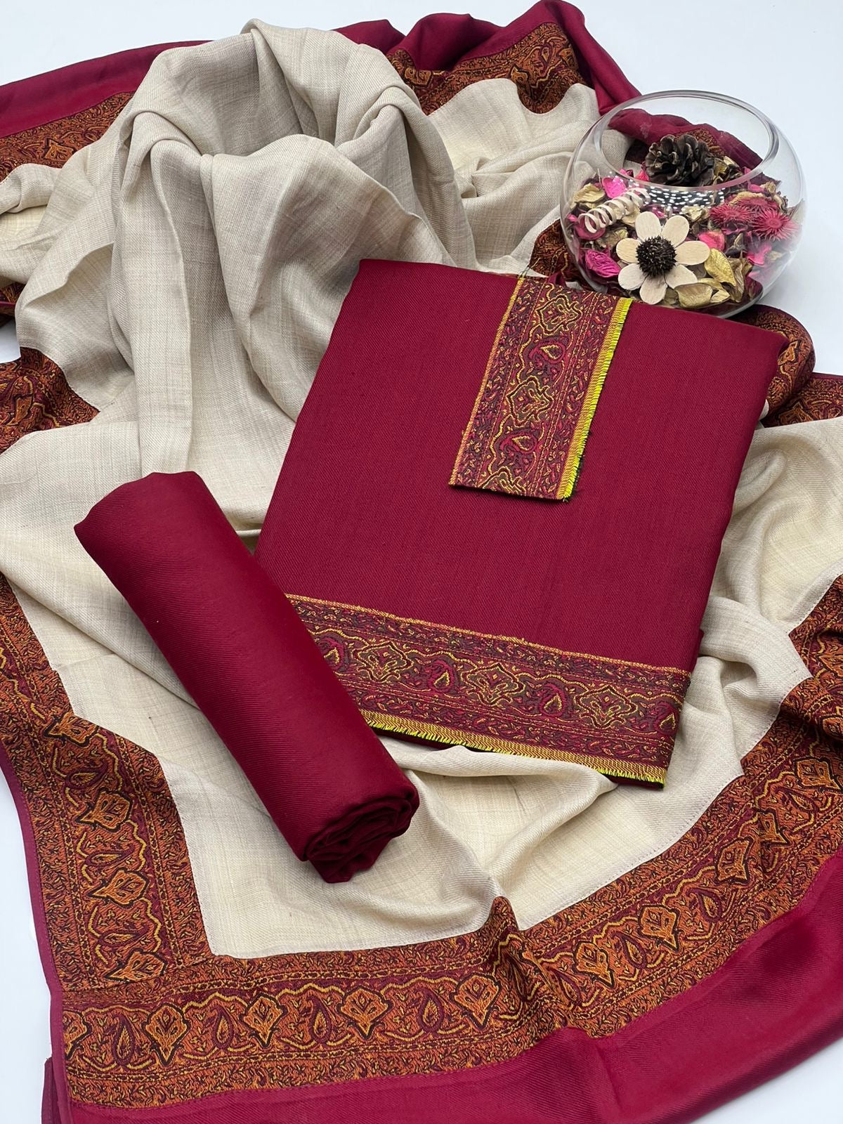 Pashmina Wool Shirt With Border And Neck Jamawar Moon Light Patch Plain Trouser Along With Pashmina Wool Jamawar Moon Light Border Shawl