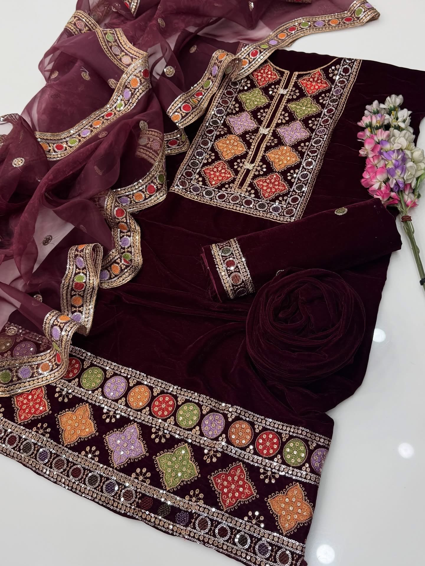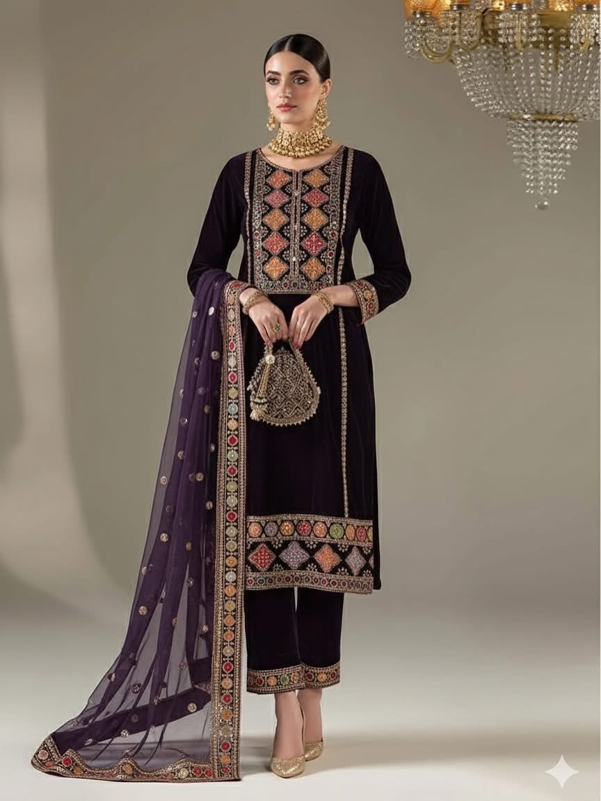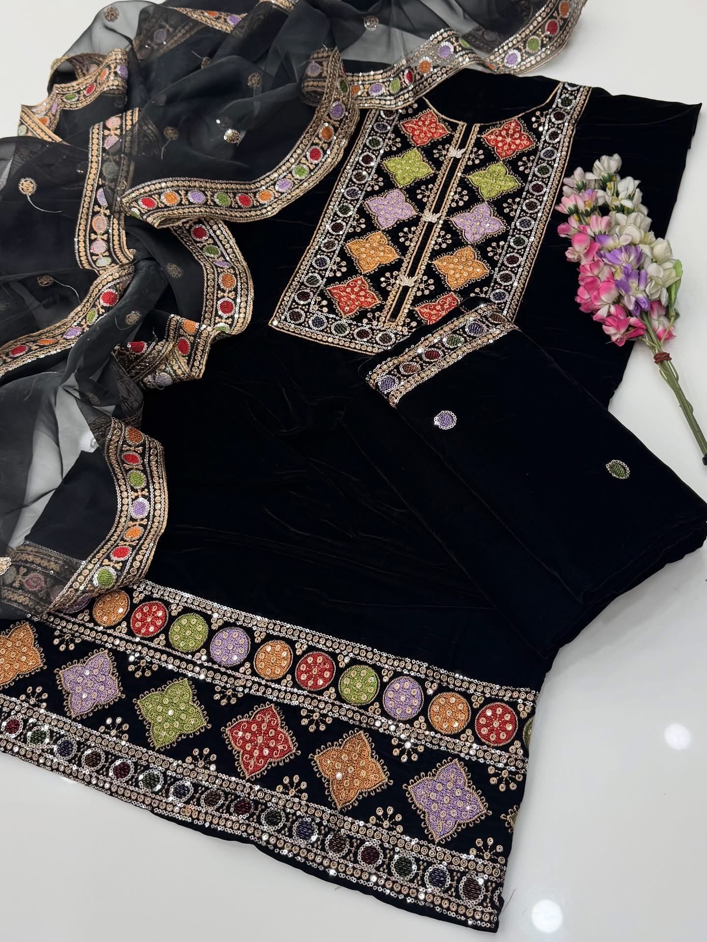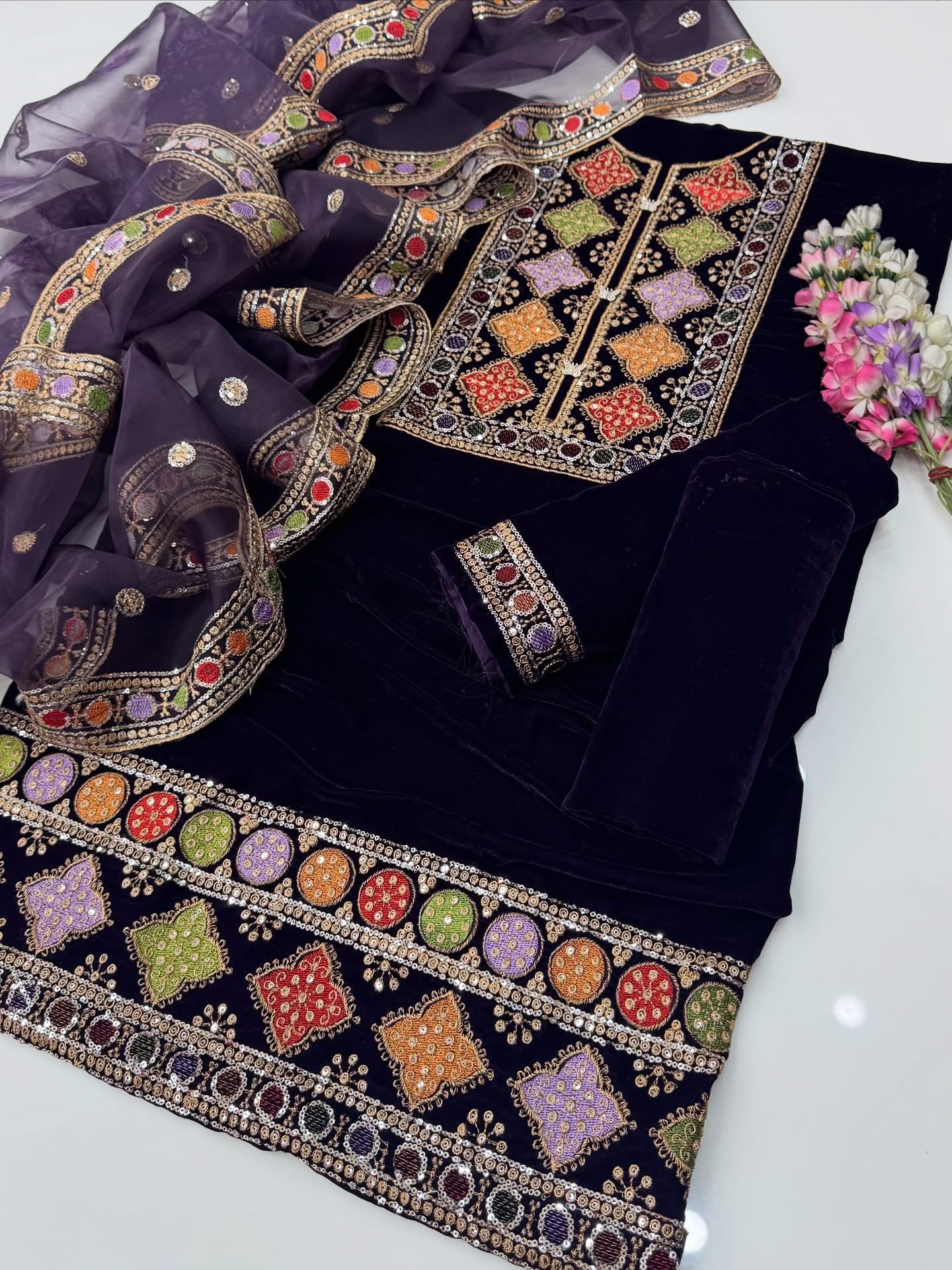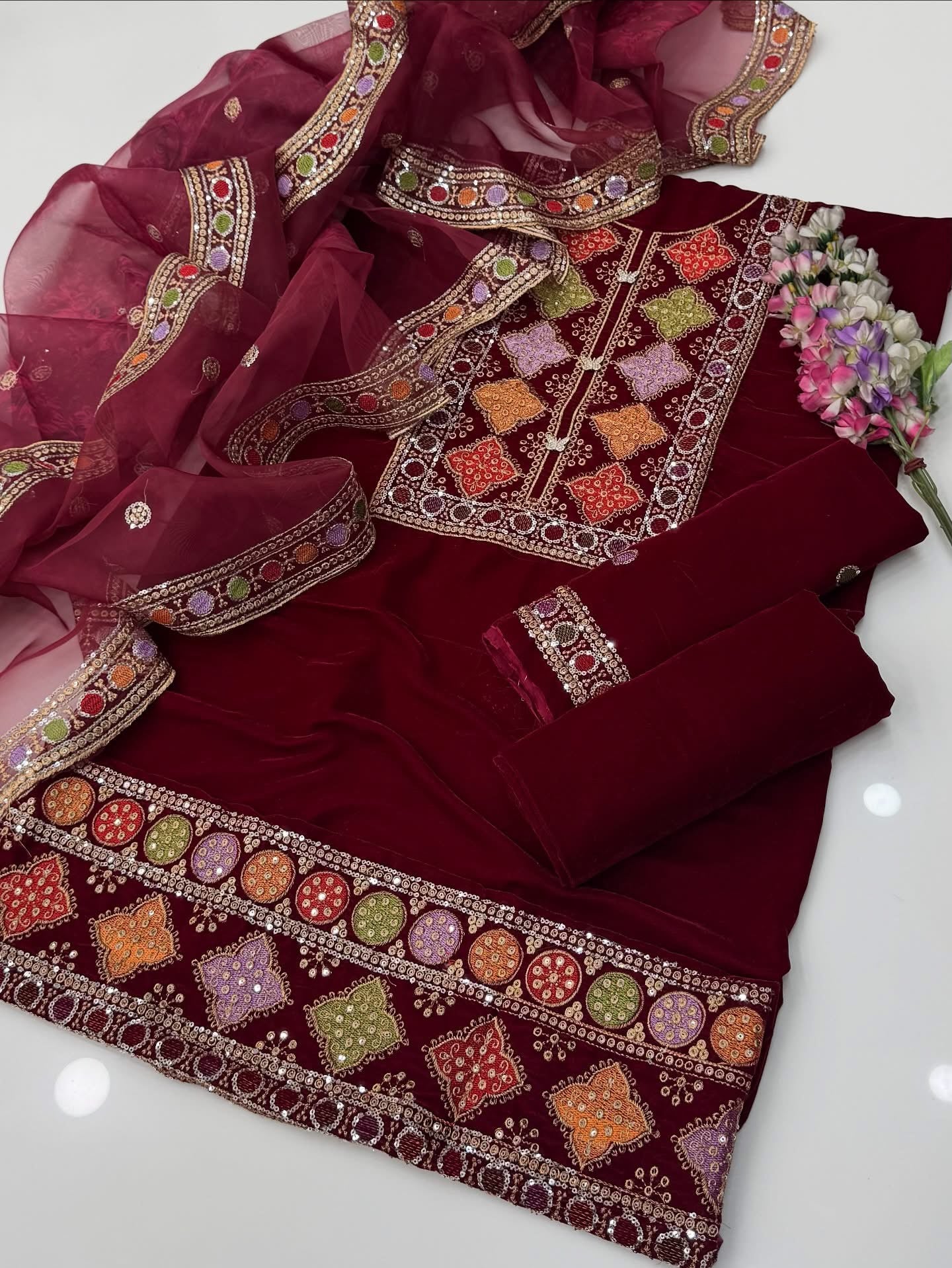 Beautiful & Elegant Aneelas Brand Bareeze Multi Embroidered Pure 9000 Micro Pound Velvet Shirt & Trouser With Fancy Organza Cut Work Duppata 3 PC Dress 👗