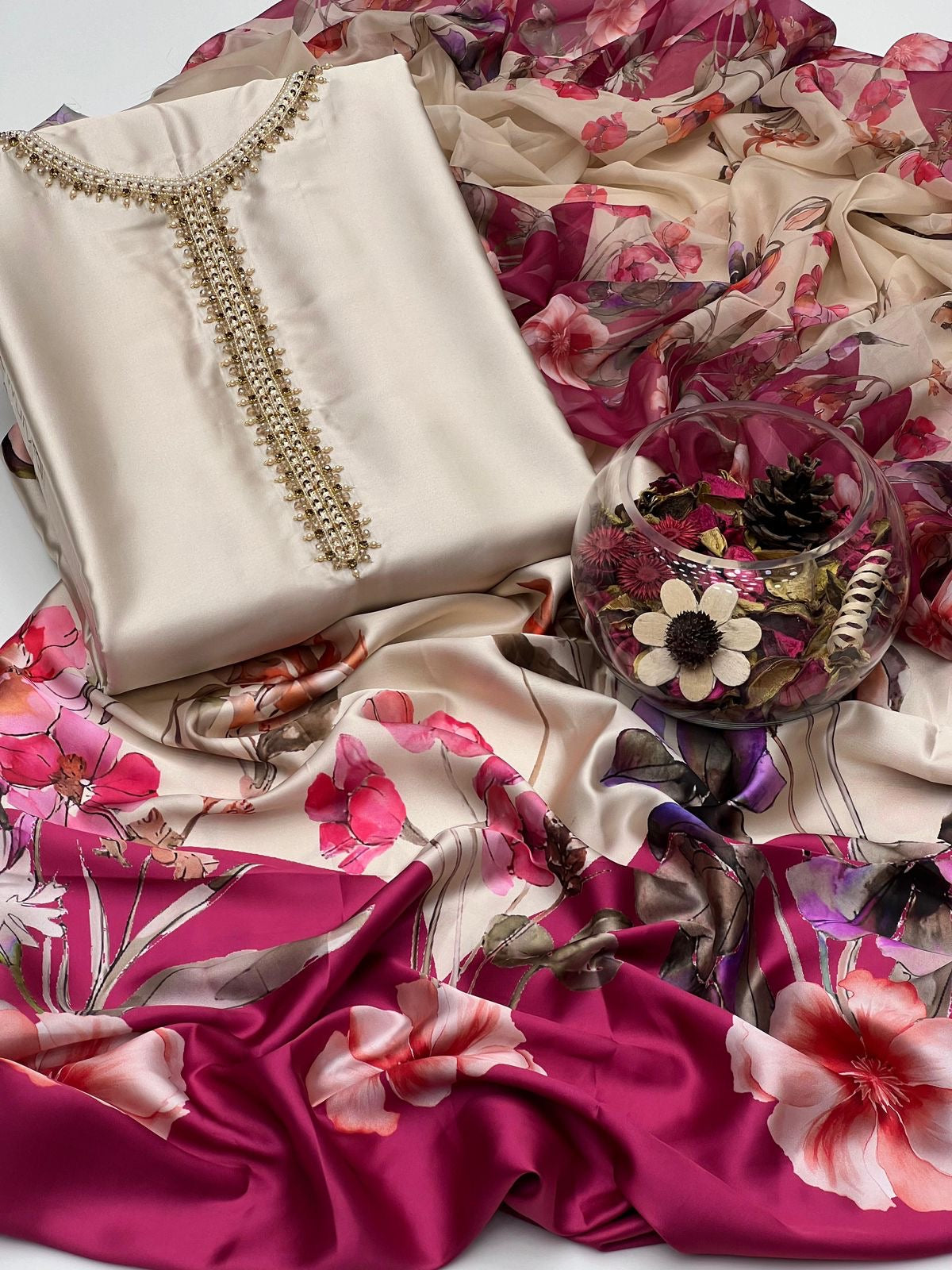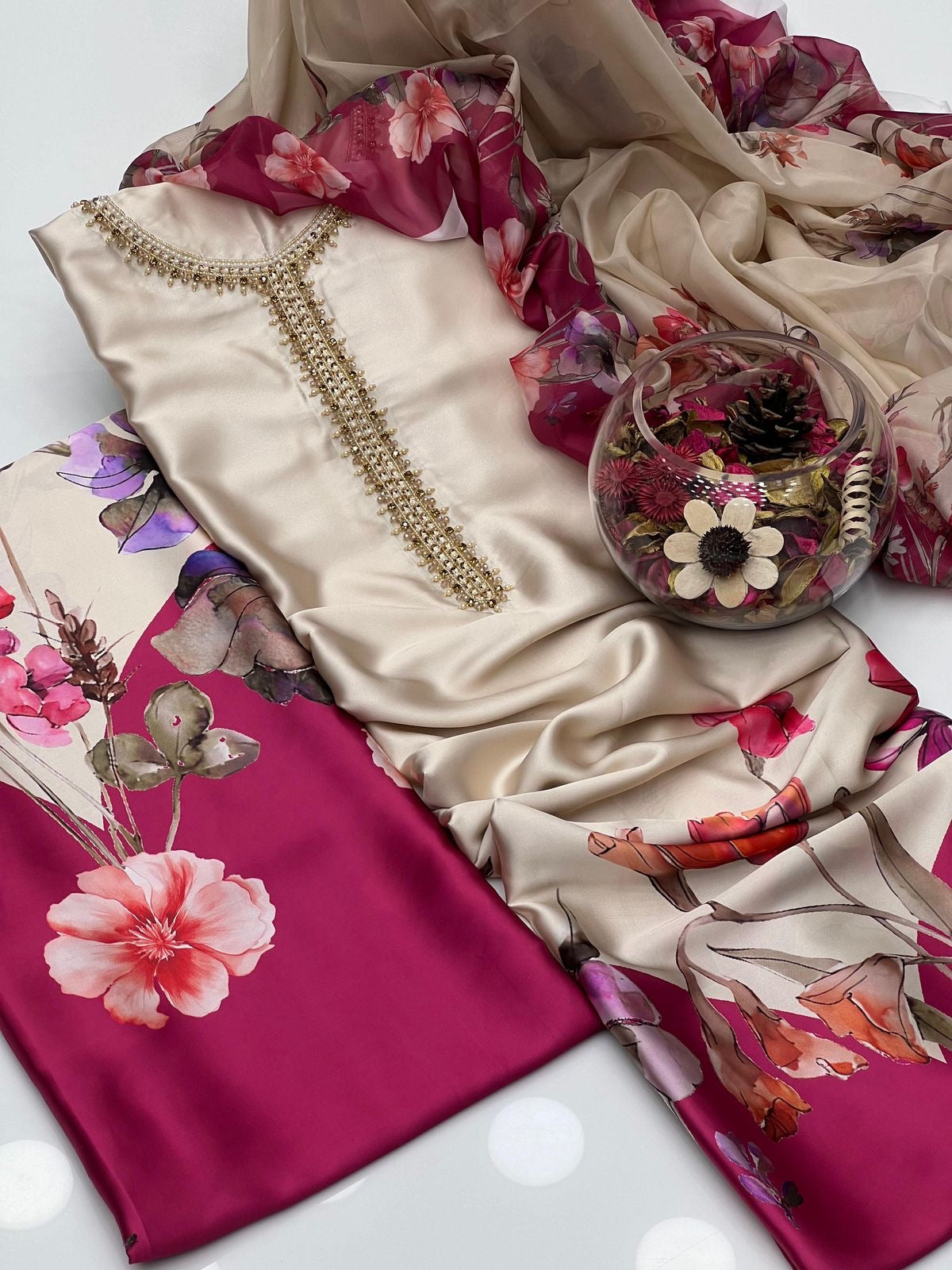 Shamoze Silk Fancy Neck Work & Digital Print Shirt With Digital Print Shamoze Silk Trouser Along With Silk Digital Print Dupatta 3Pcs Dress 👗