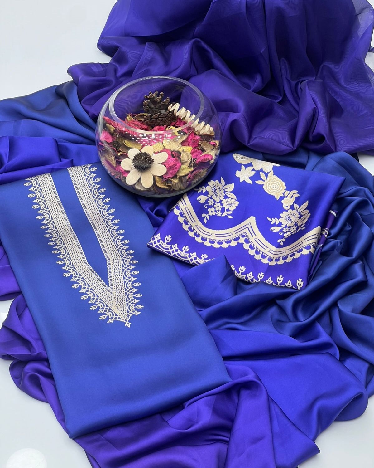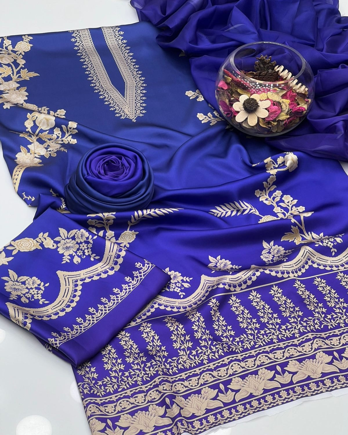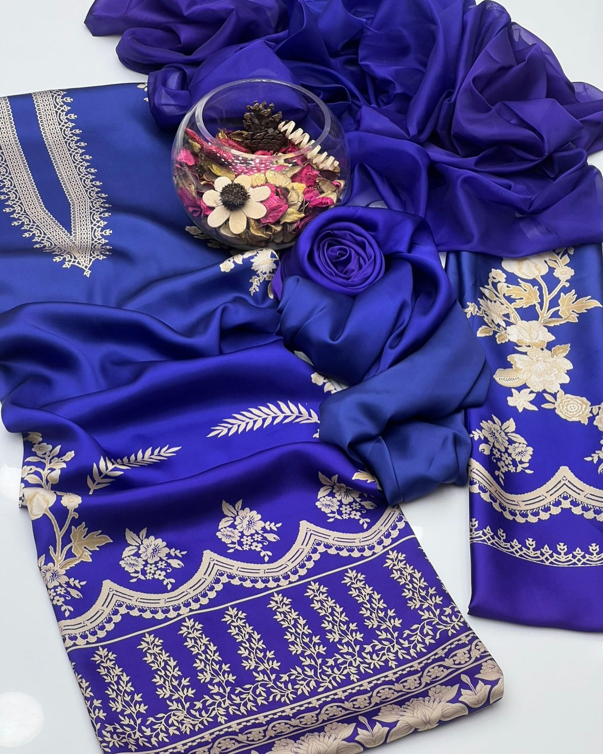 Shamoze Silk Digital Print Shirt & Sleeves With Simple Shamoze Silk Trouser Along With Silk Digital Print Dupatta 3Pcs Dress 👗.