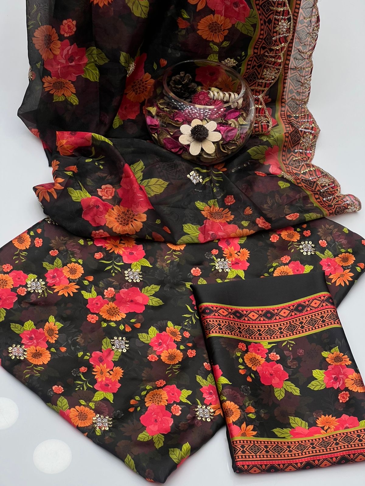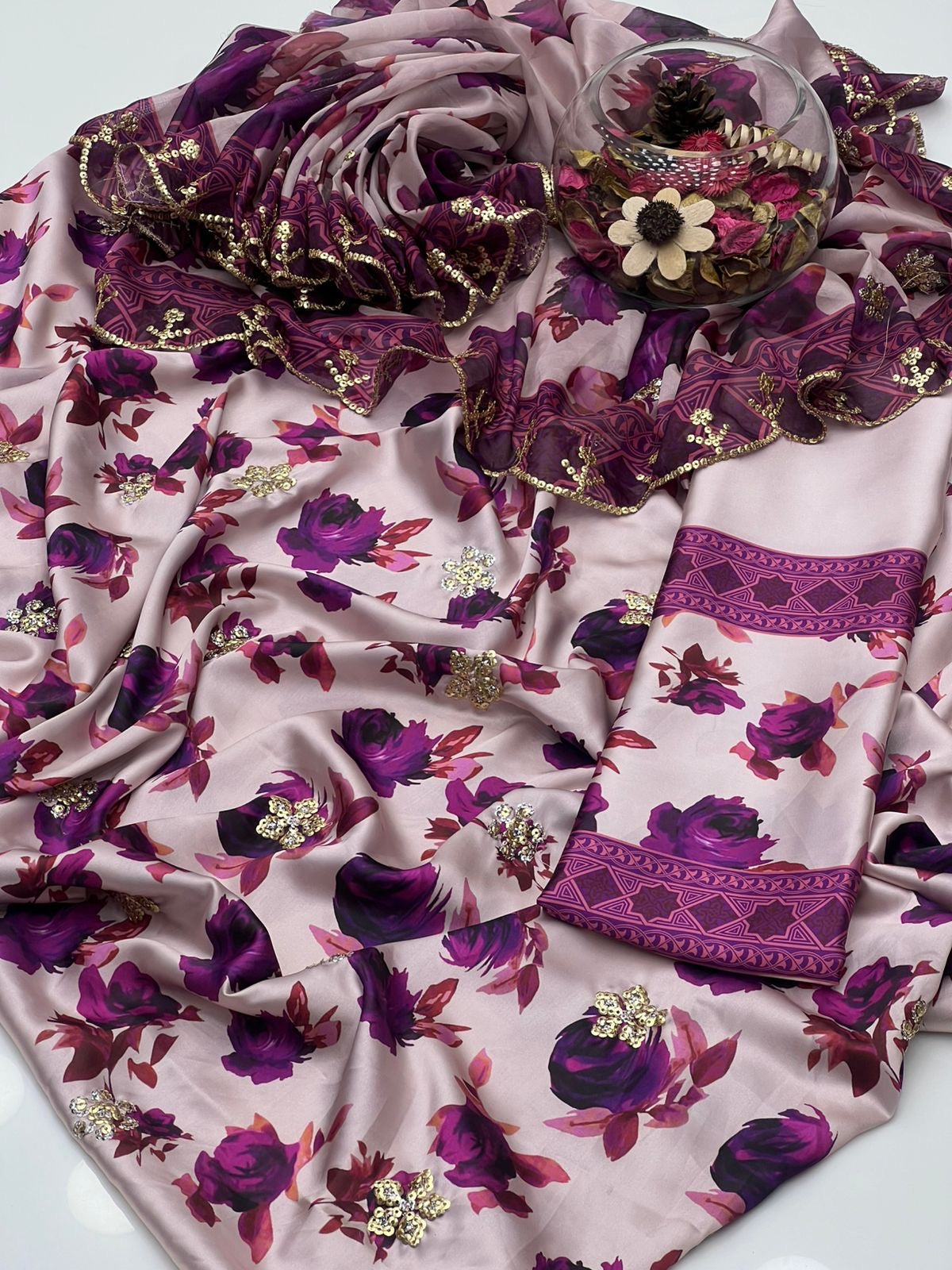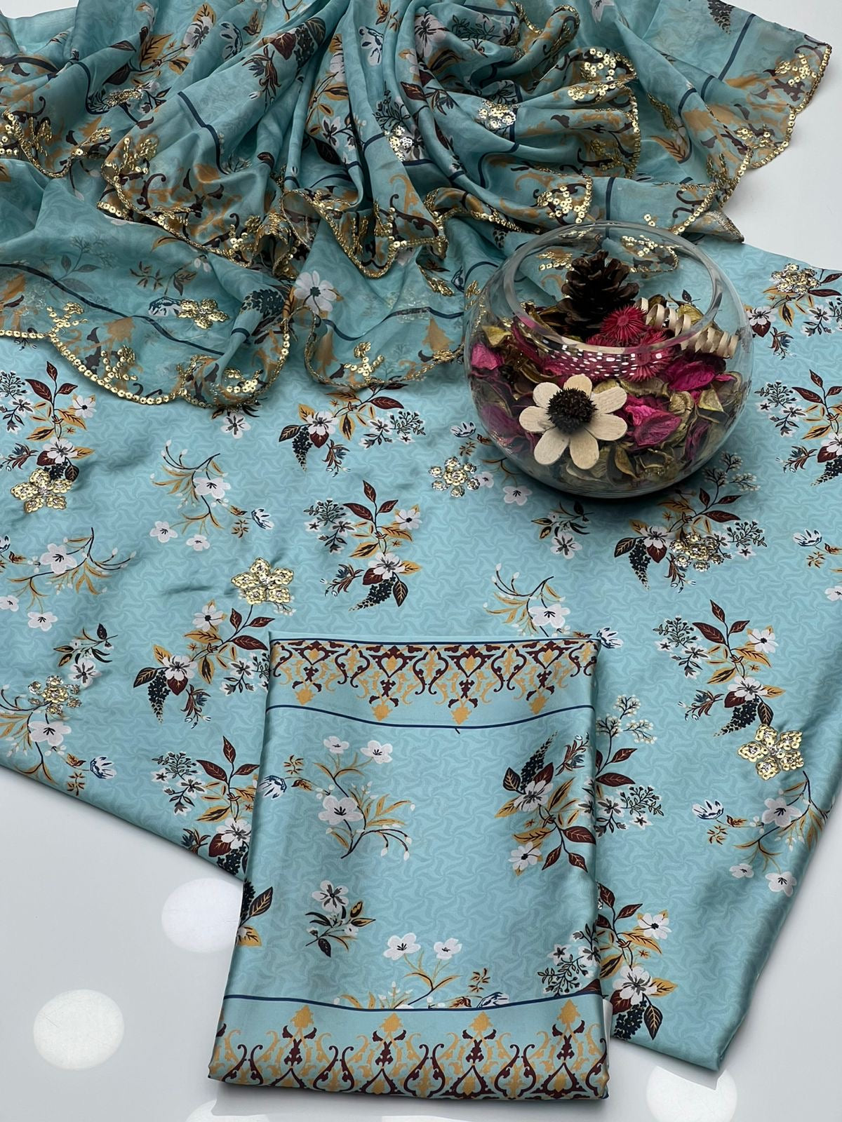 Premium Shamoze Silk Digital Print Matt Sequence, Embroidery Allover Botti Work Shirt,With Digital Print Trouser Along With Silk Matt Sequence, Embroidery Dupatta 3Pcs Dress ๐.ย