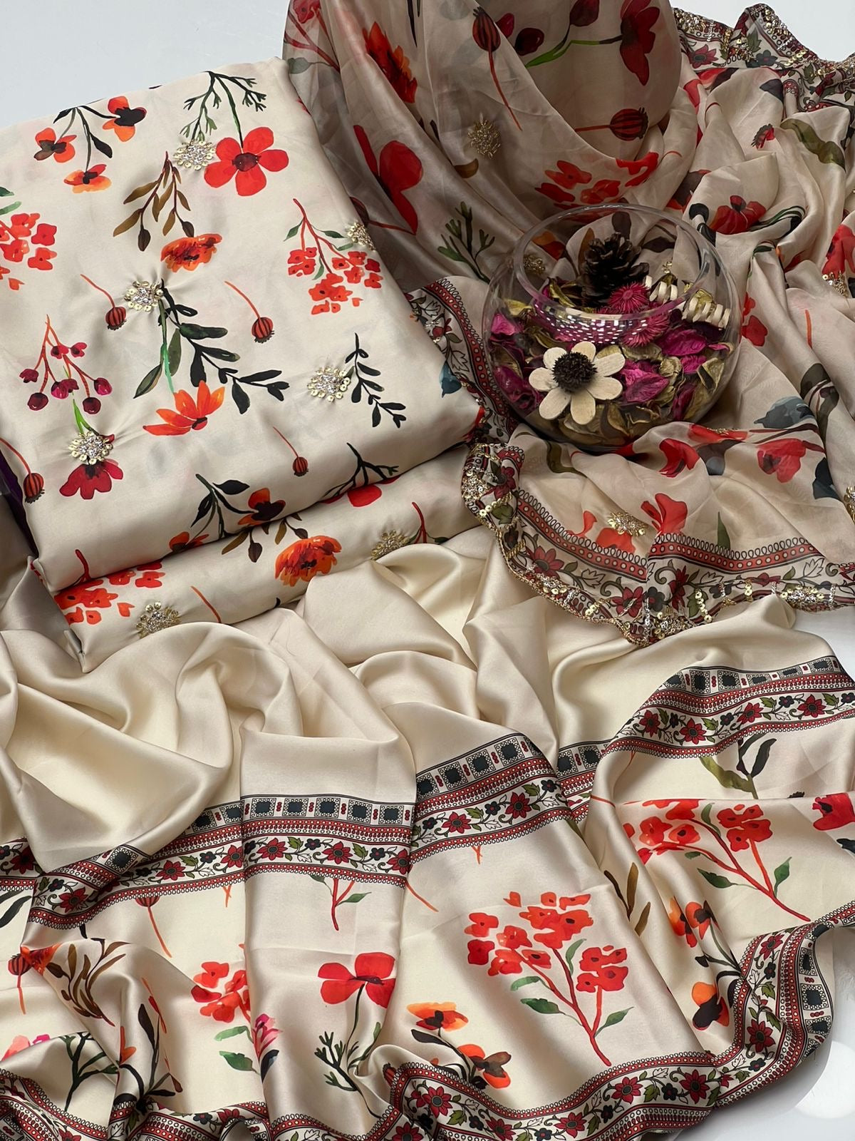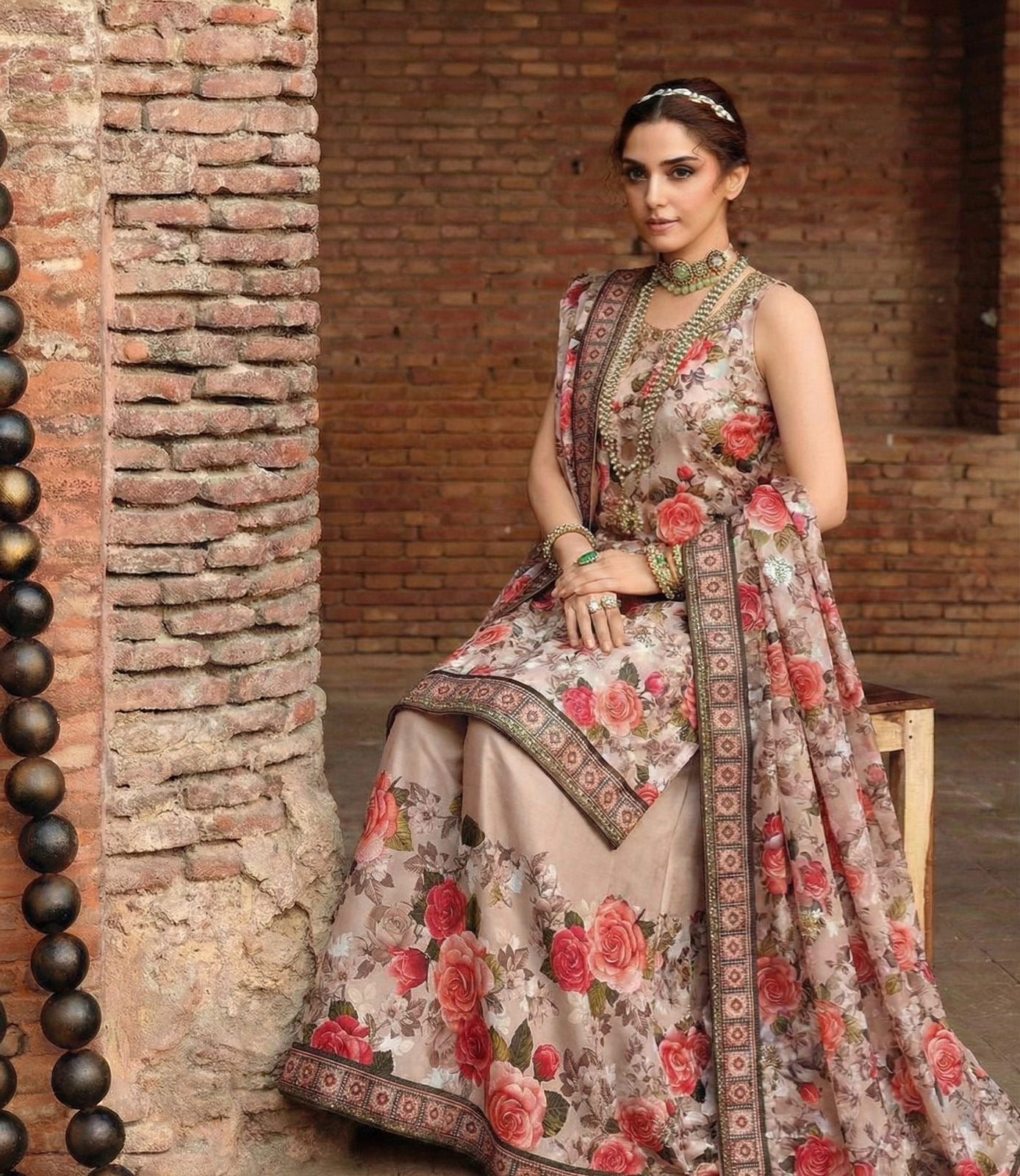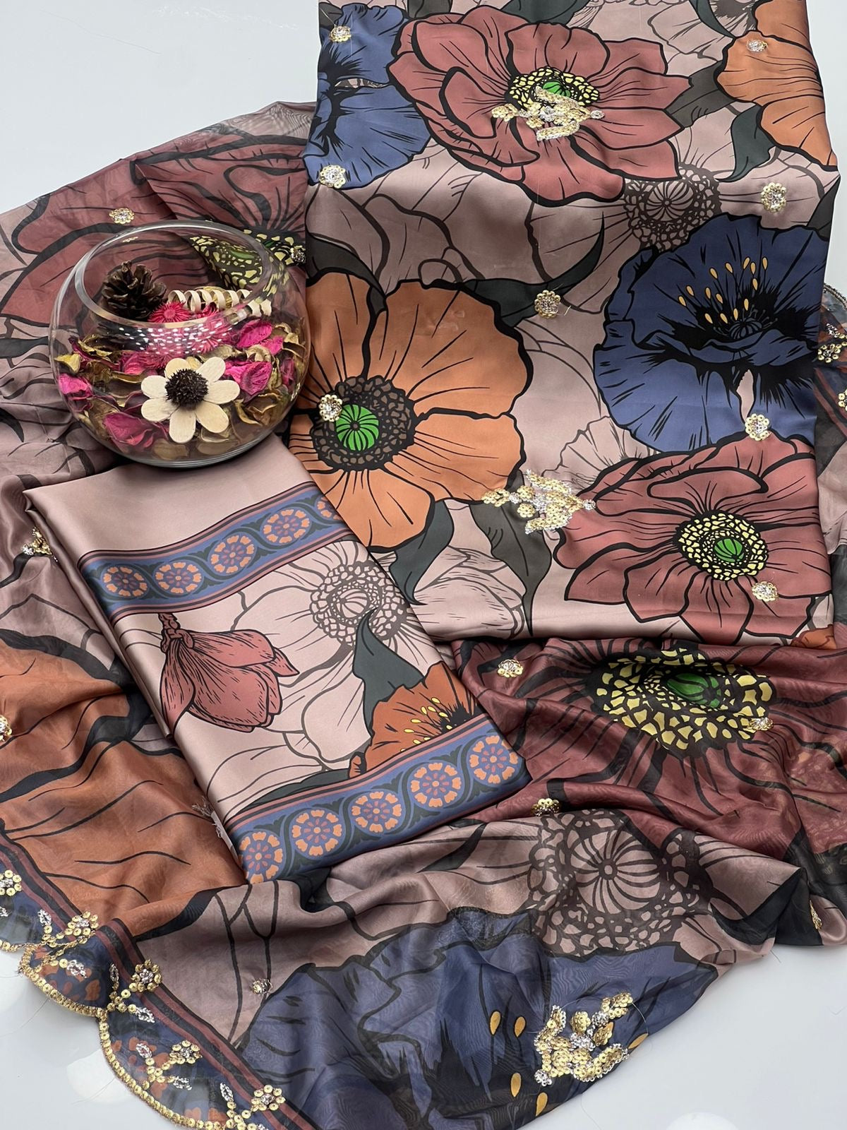 Premium Shamoze Silk Digital Print Matt Sequence, Embroidery Allover Botti Work Shirt,With Digital Print Trouser Along With Silk Matt Sequence, Embroidery Dupatta 3Pcs Dress ๐.ย