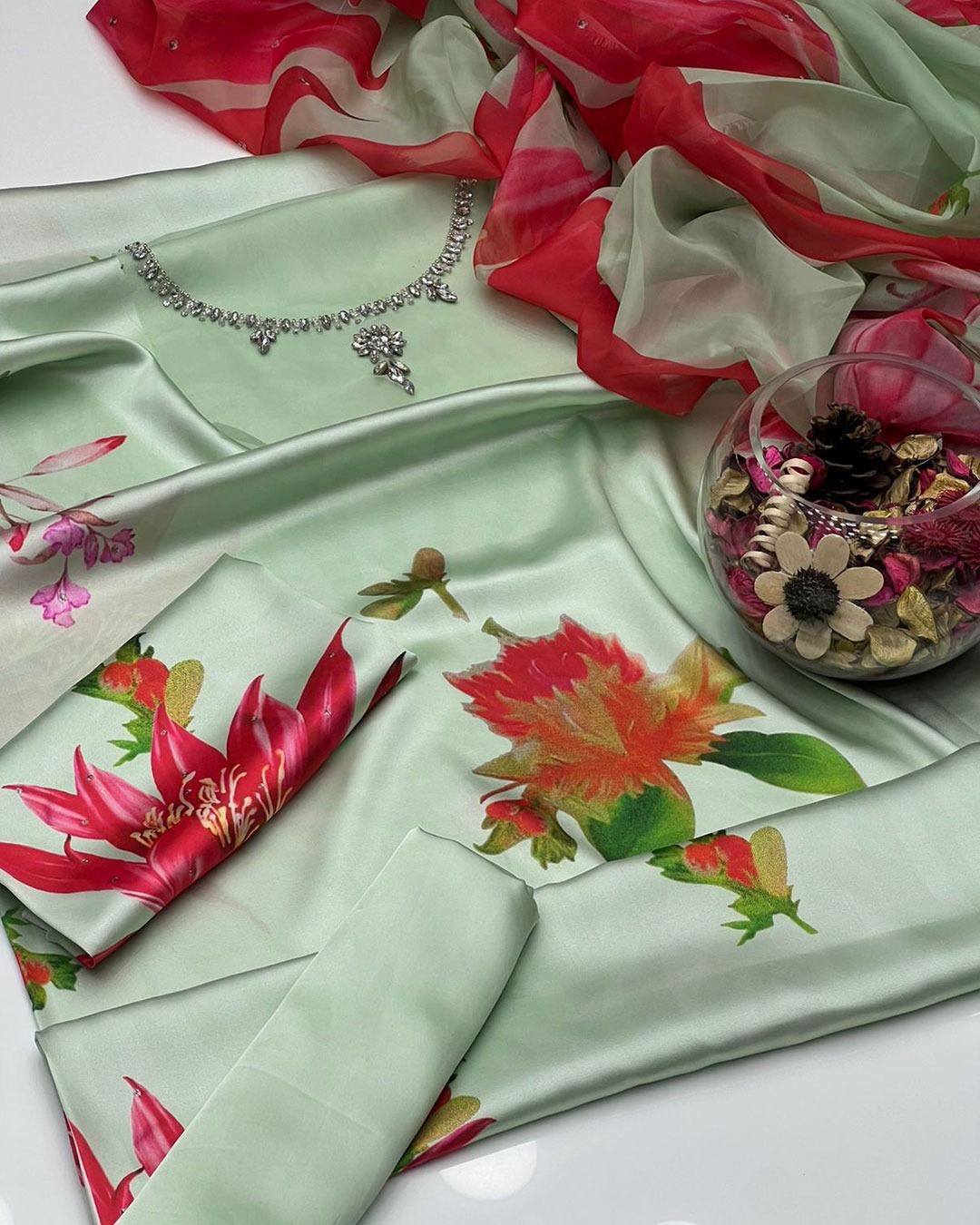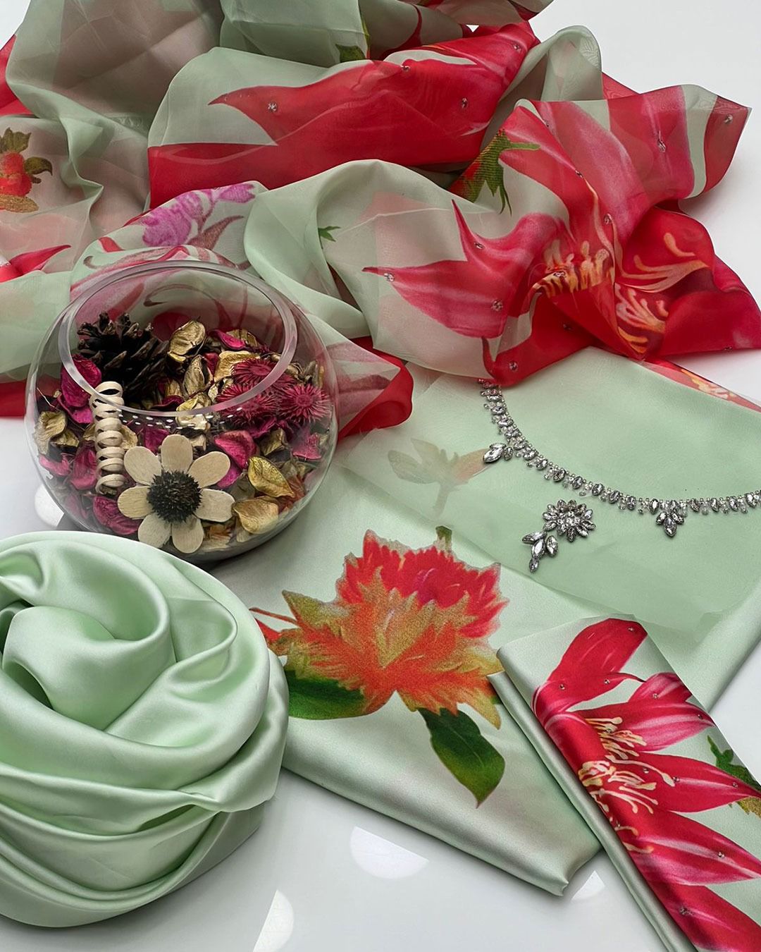Shamoze Silk Fancy Neck Work Patch  & Digital Print Shirt With Digital Print Shamoze Silk Trouser Along With Silk Digital Print Dupatta 3Pcs Dress 👗
