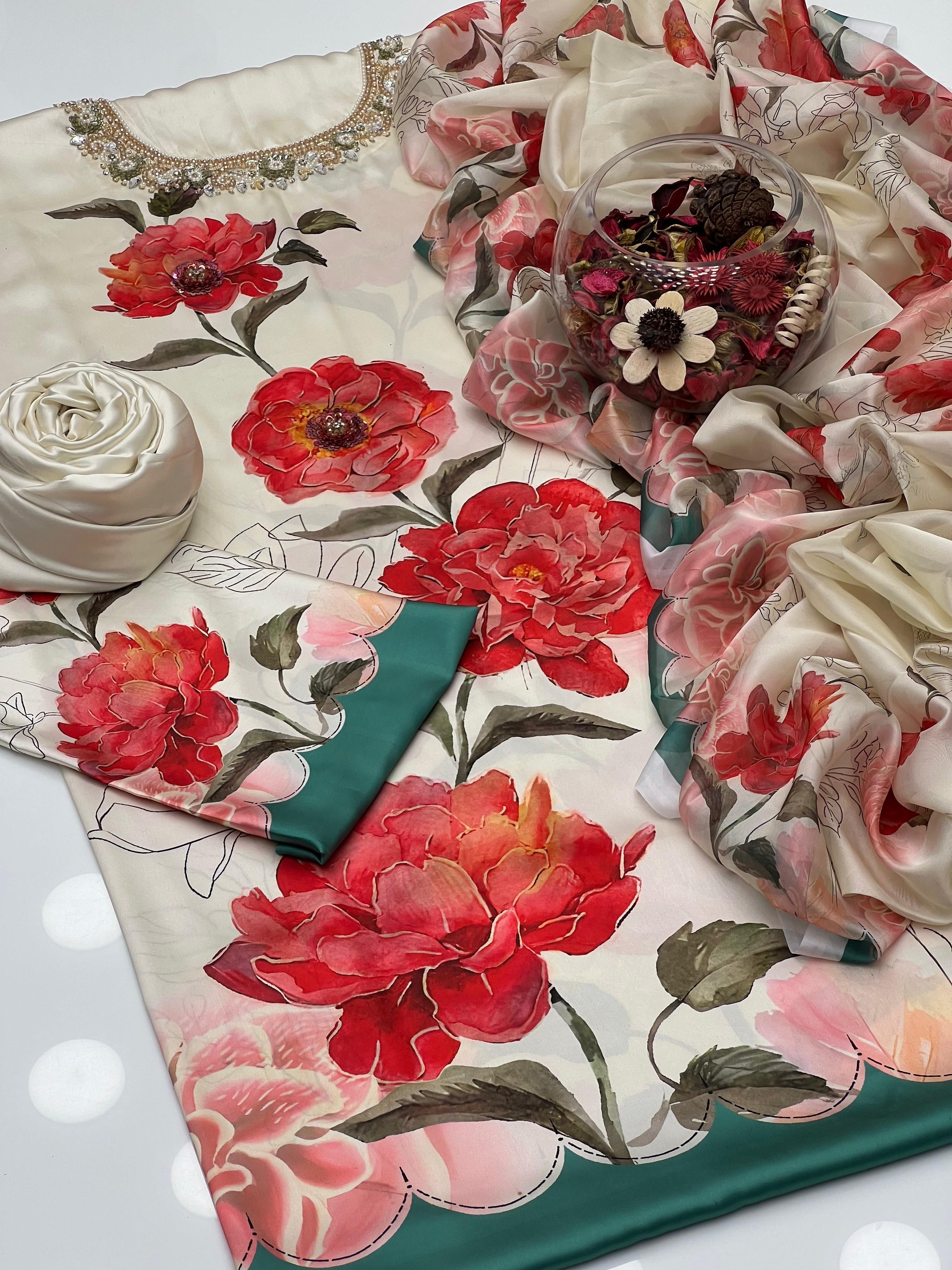 Shamoze Silk Fancy Neck & Fancy Flower Work With Digital Print Shirt & Digital Print Sleeves With Simple Shamoze Silk Trouser Along With Silk Digital Print Dupatta 3 Pcs Dress 👗.Â