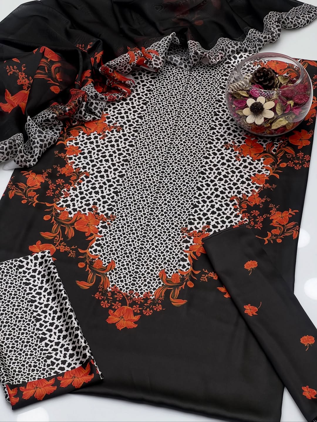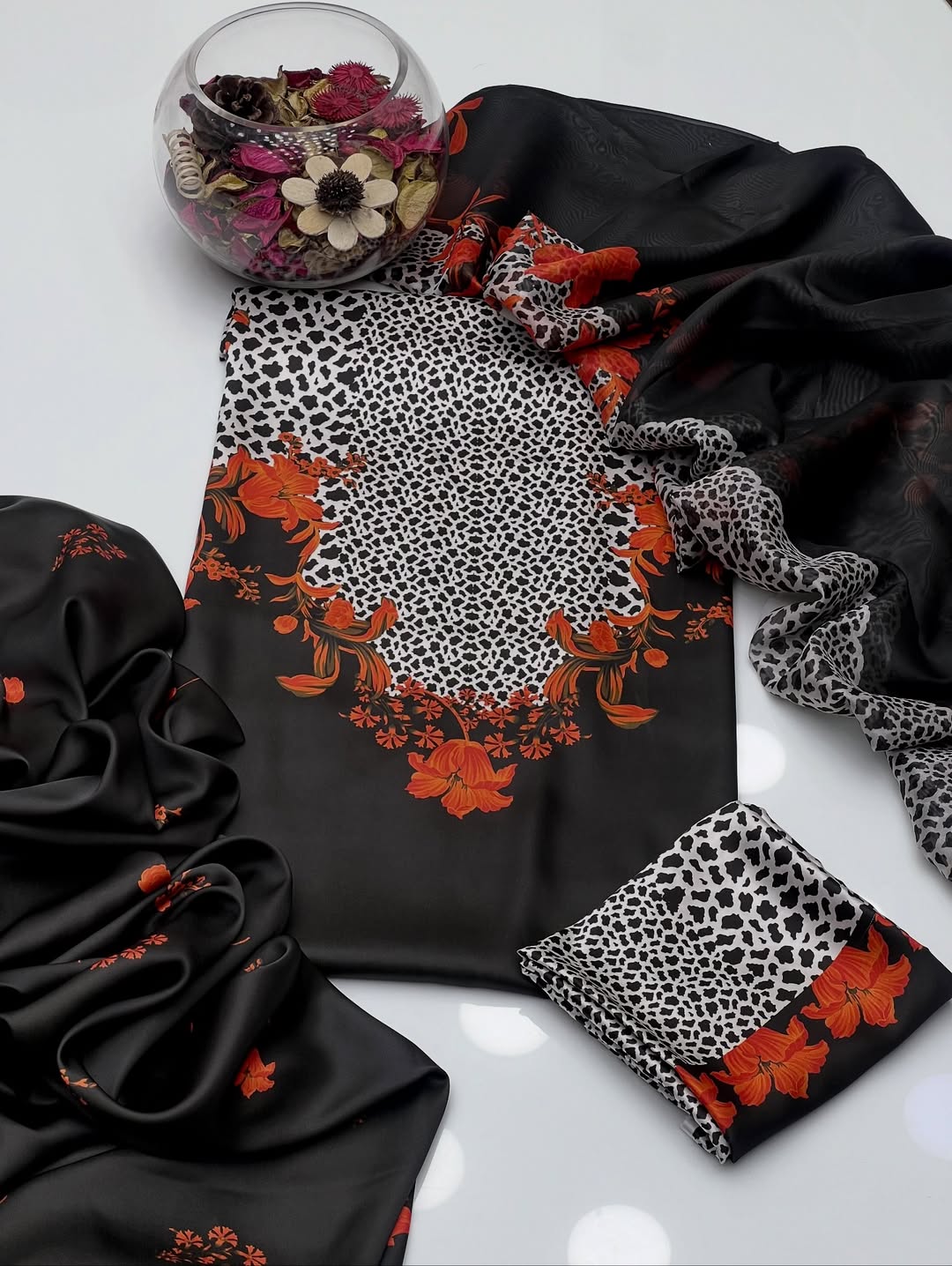 Experience the vibrant, intricate, and high-quality design of Shamoze Silk Digital Tye 'N' Dye Print. This stunning 3 piece dress set includes a shirt, trouser, and dupatta with silk digital tye 'n' dye print