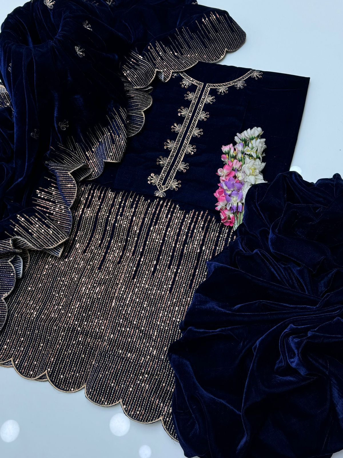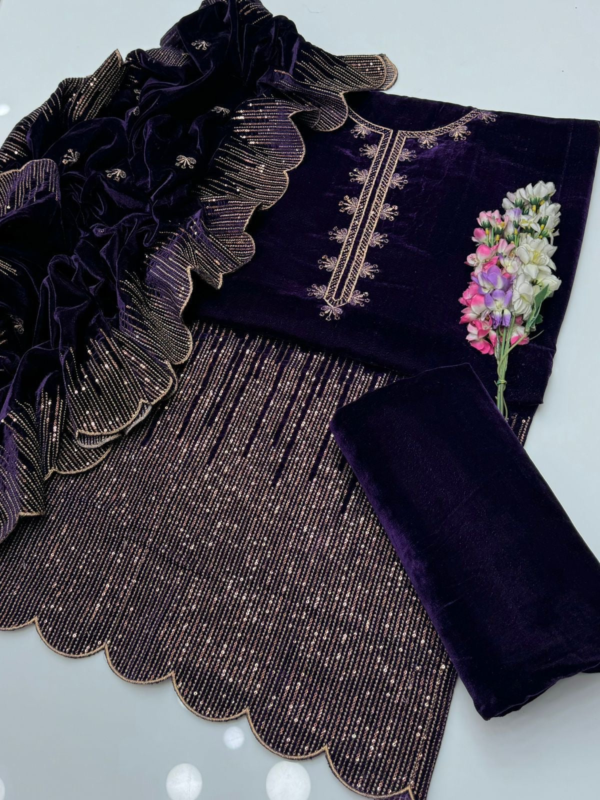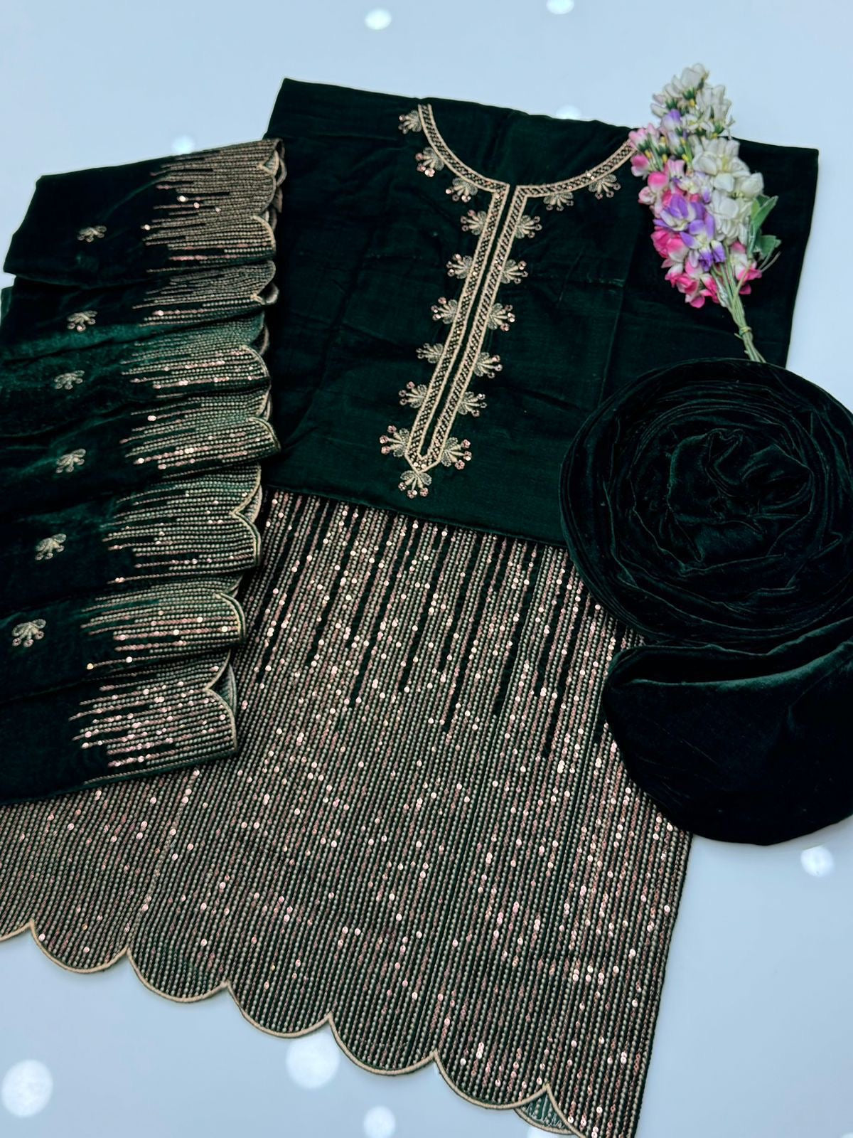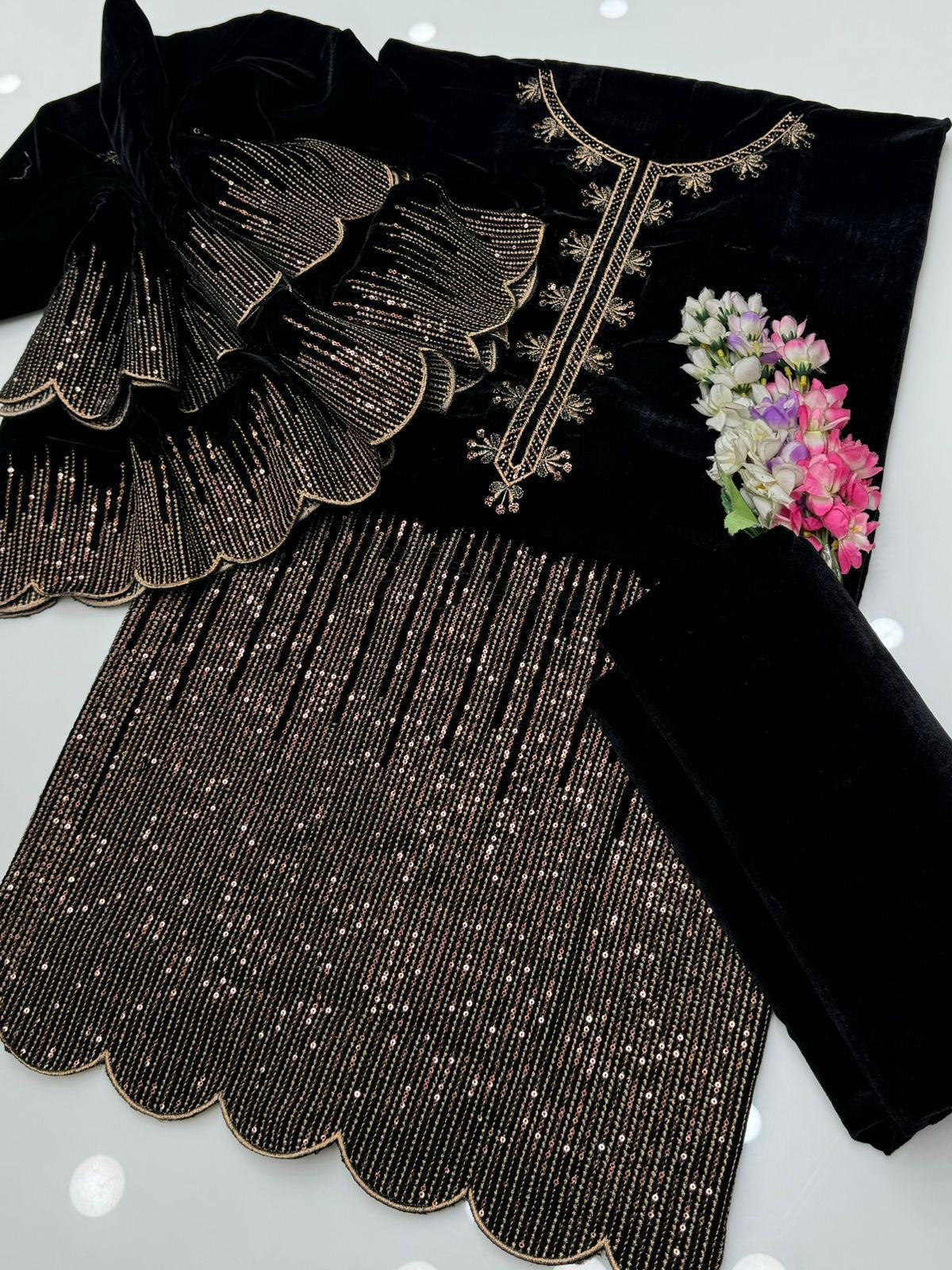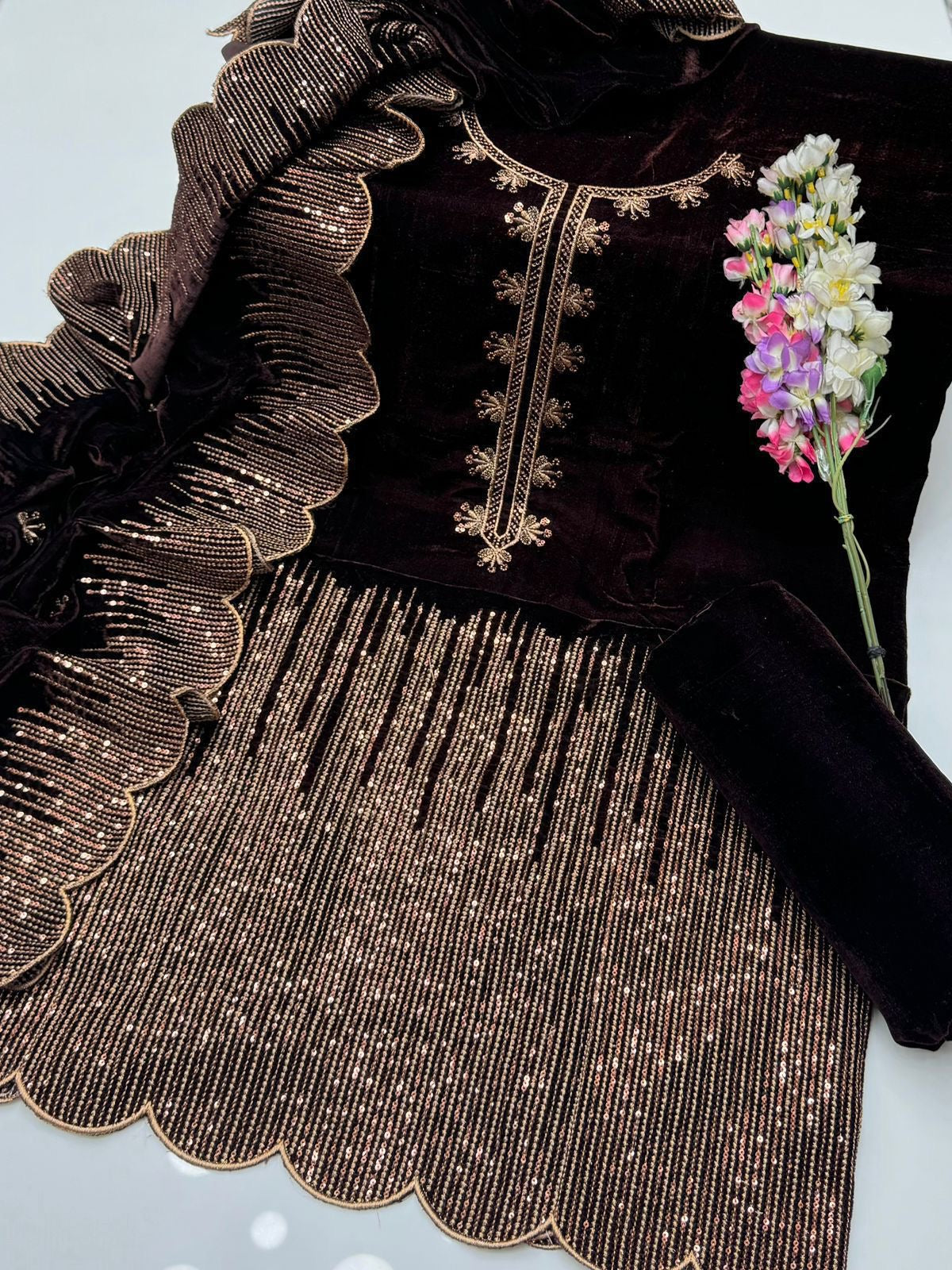 One Of The beautiful Tila Zari Gala heavy Zigzeg Daman Micro Pound Velvet Shirt And Trouser Along With Velvet Heavy 2 Sided Border CutWork Shawl,💫3pcs Dress