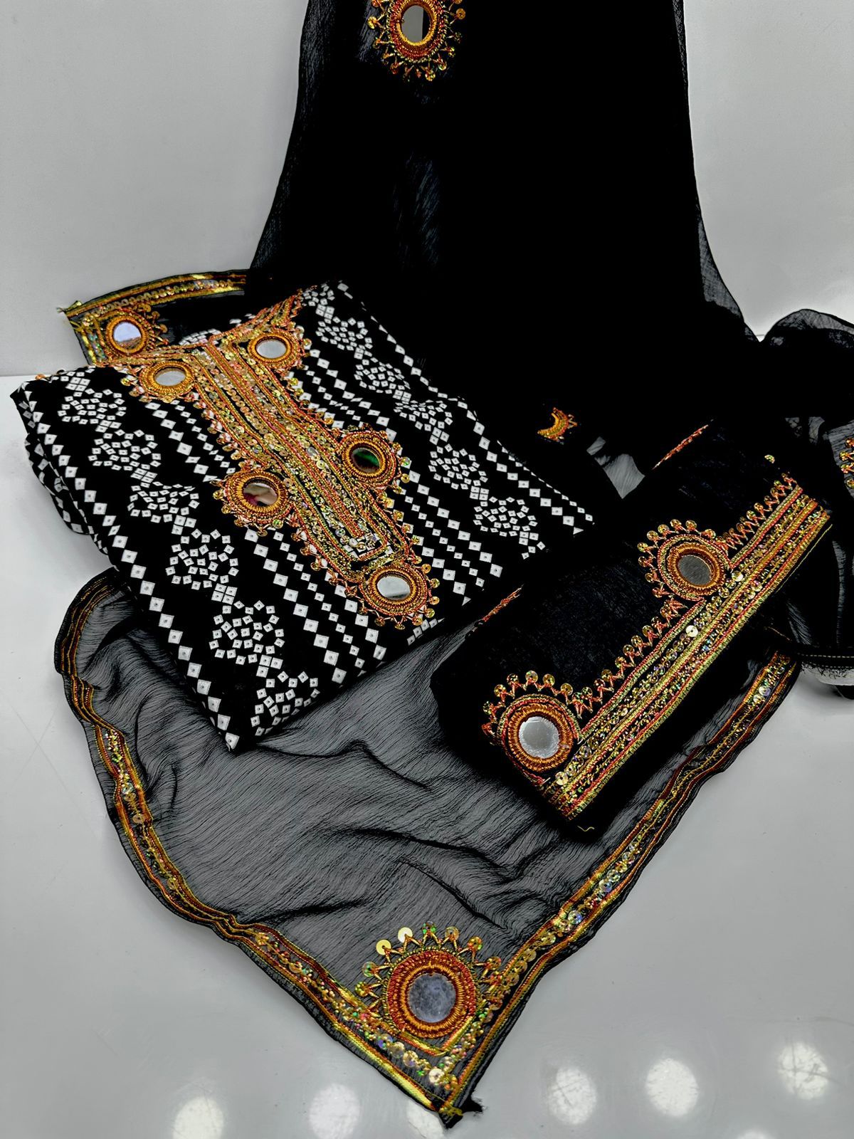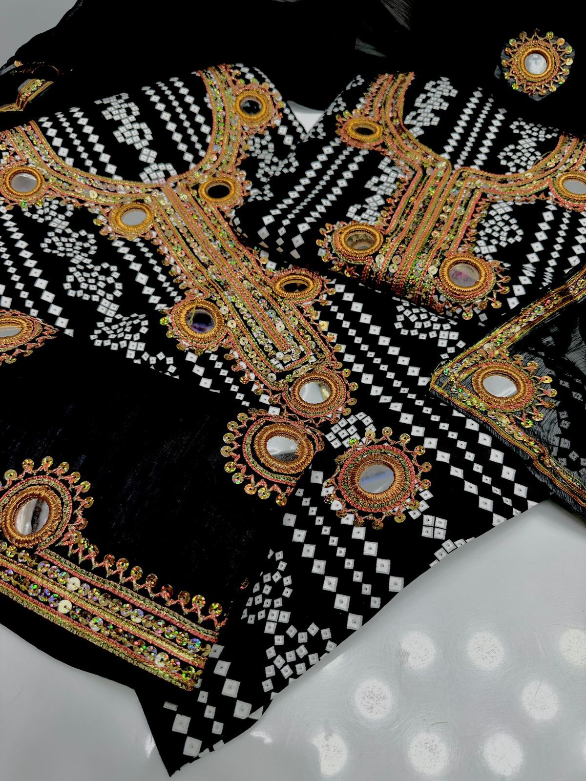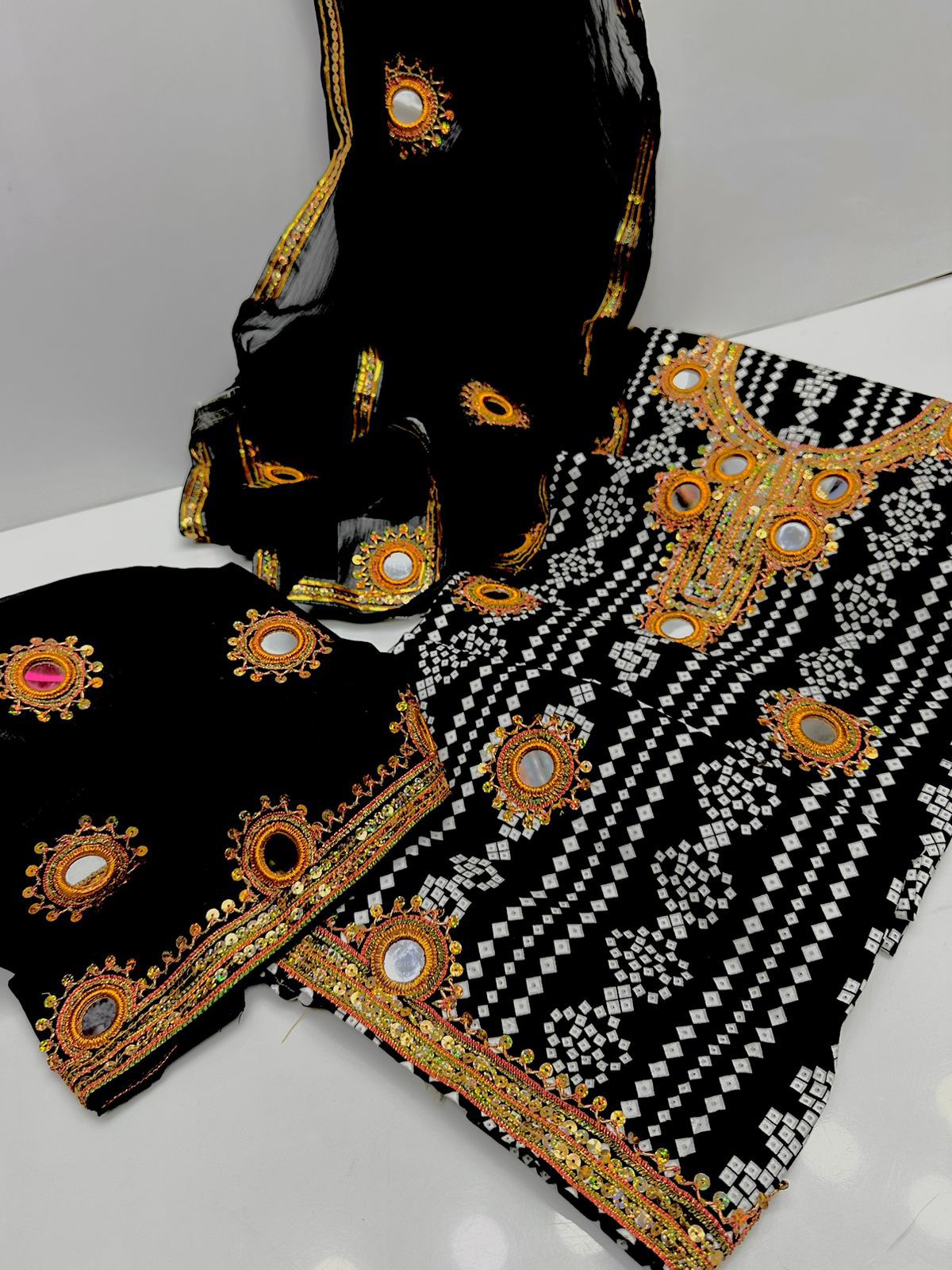 HANDMADE ZARI GOTTA WORK WITH 21MM ORIGINAL SHEESHA ON CHUNRI PRINT LAWN SHIRT N TROUSER WITH 4 SIDES GOTTA WORK CHIFFON DUPPATTA 3 PC DRESS