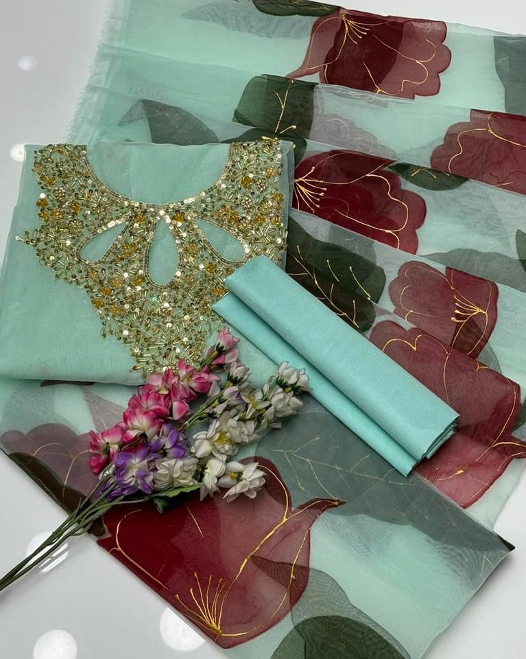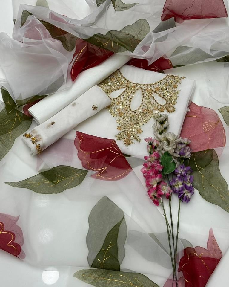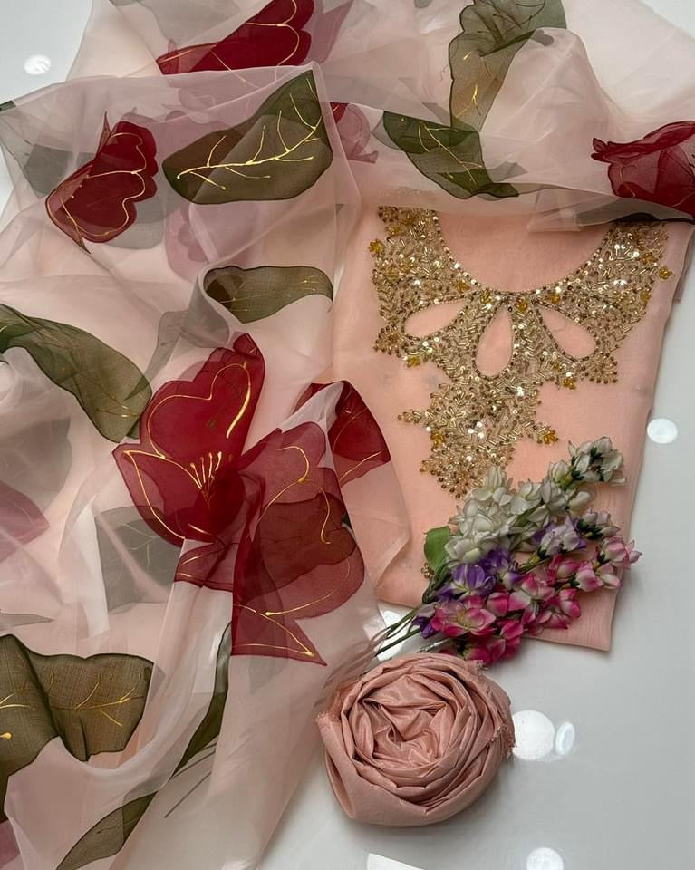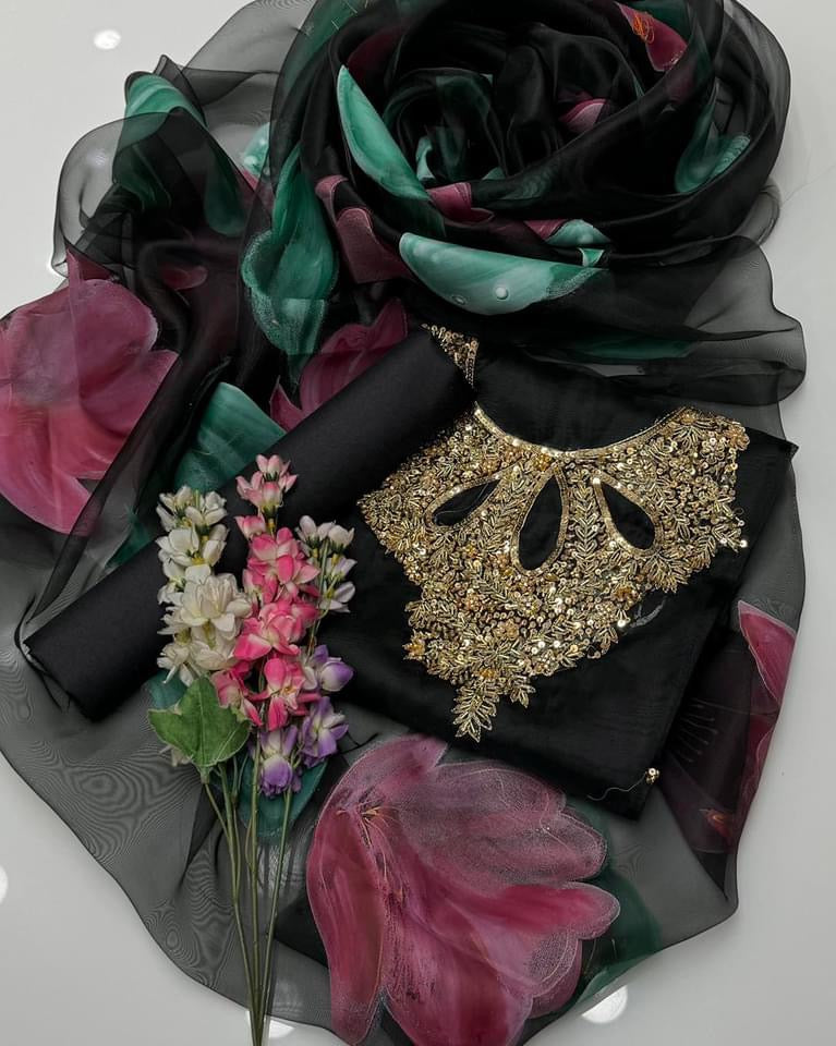 Handwork Stones And Beads Tilla adda Work Organza Shirt With Oil Paint Organza Duppata along with kathan silk trouser 3 Pc Dress 👗